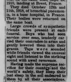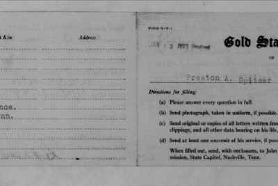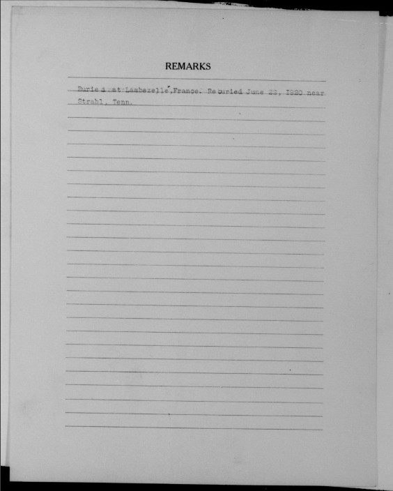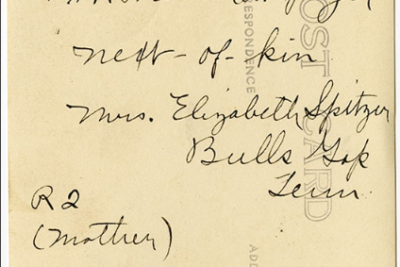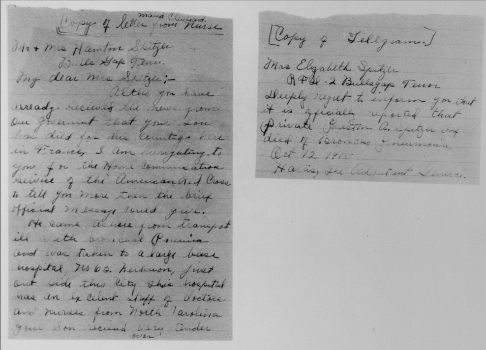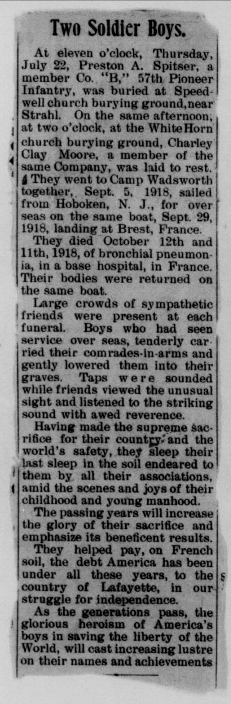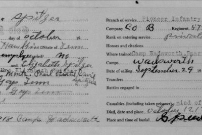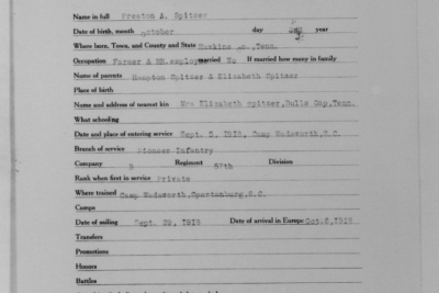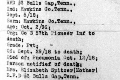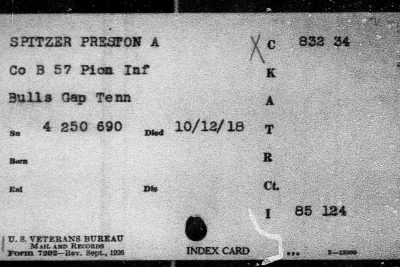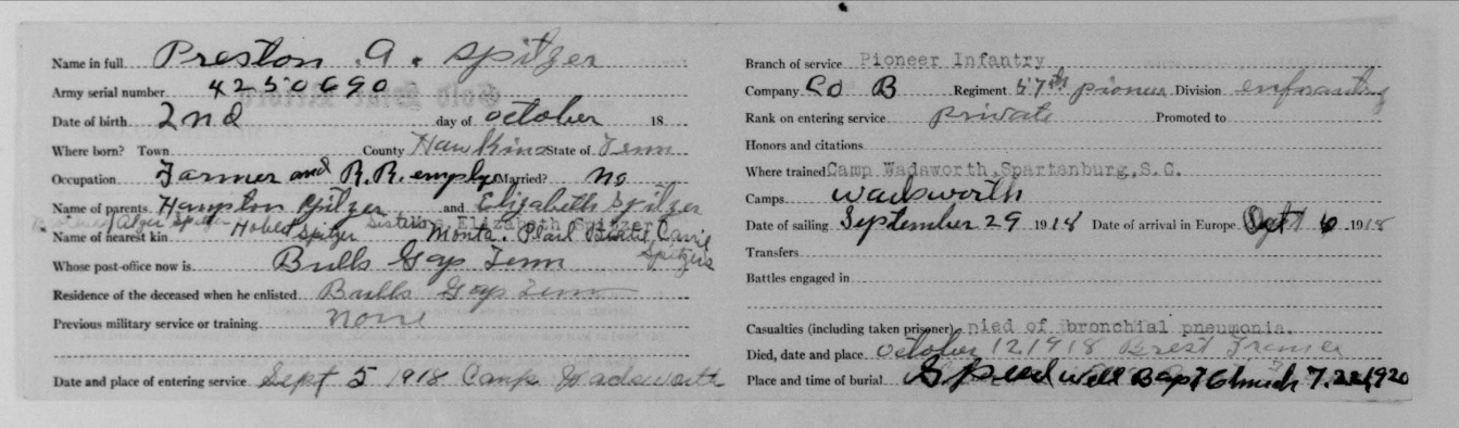 Preston A. Spitzer was born 2 October 1896 to Hampton and Elizabeth Spitzer. He was a farmer and RR employee before entering the service on 5 September 1918 at Camp Wadsworth in South Carolina. He sailed to Europe on September 29, arriving on October 6, 1918. Pvt Spitzer died at Brest, France of bronchial pneumonia on 12 October 1918. He was initially buried at Labezelle in France. He is buried at Speedwell Missionary Baptist Church Cemetery, Bulls Gap, Hawkins County, Tennessee.