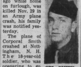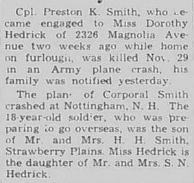 Cpl. Preston K. Smith, who became engaged to Miss Dorothy Hedrick of 2326 Magnolia Avenue two weeks ago while home on furlough, was killed Nov. 29 in an Army plane crash, his family was notified yesterday. The plane of Corporal Smith crashed at Nottingham, N.H. The 18-year-old soldier, who was preparing to go overseas, was the son of Mr. and Mrs. H.H. Smith, Strawberry Plains. Miss Hedrick is the daughter of Mr. and Mrs. S.N. Hedrick. Besides his parents, he is survived by two brothers, Sgt. Syrus H. and Pfc. William D., who are in the service; O.Y. and Alfred, Mascot and one sister, Mrs. Irene Sherrod of Knoxville.