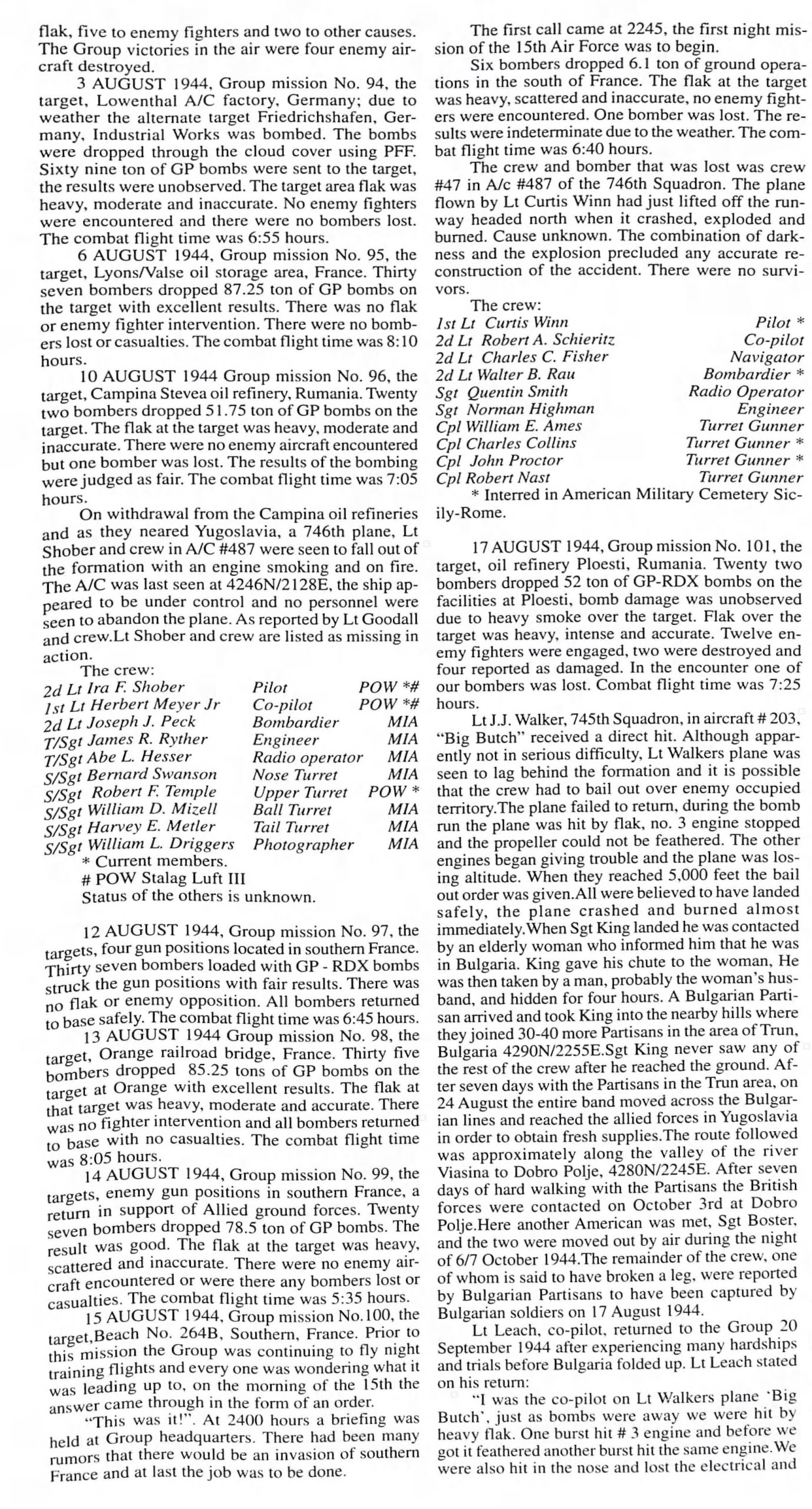 The first call came at 2245, the first night mission of the 15th Air Force was to begin. Six bombers dropped 6.1 ton of ground operations in the south of France. The flat at the target was heavy, scattered and inaccurate, no enemy fighters were encountered. One bomber was lost. The results were indeterminate due to the weather. The combat fight time was 6:40 hours. The crew and bomber that was lost was crew #47 in A/C #487 of the 746th Squadron. The plane flown by Lt Curtis Winn had just lifted off the runway headed north when it crashed, exploded and burned. Cause unknown. The combination of darkness and the explosion precluded any accurate reconstruction of the accident. There were no survivors.