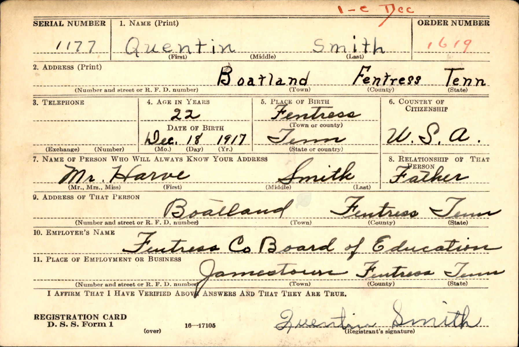 Quentin Smith was born on 18 December 1917, Fentress County, Tennessee, the son of Harve Smith and Lodicey ” Dice ” Elizabeth Beaty .