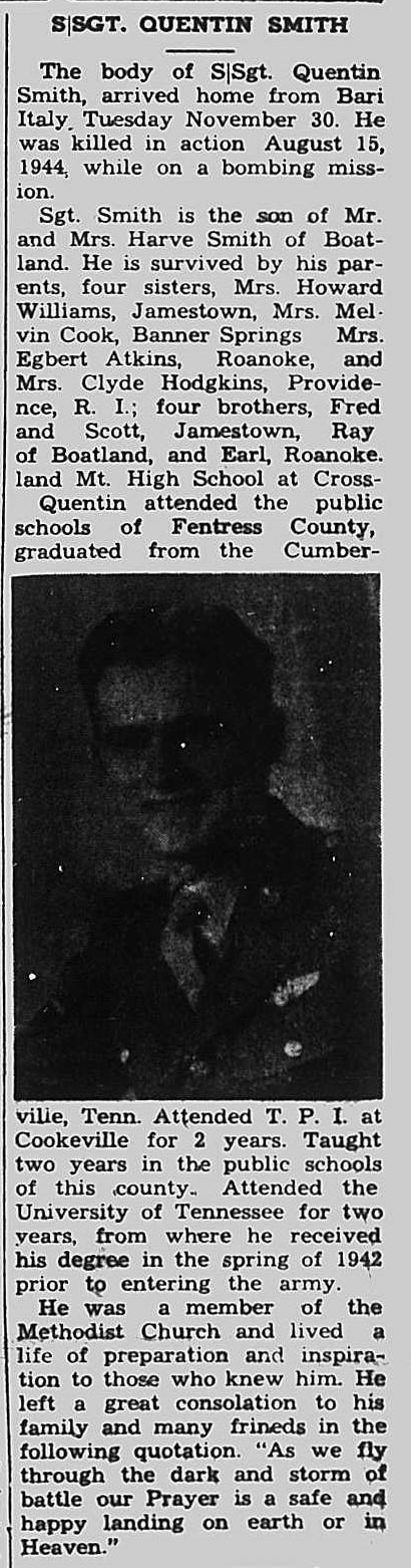 The body of S/Sgt Quentin Smith, arrived home from Bari, Italy, Tuesday November 30. He was killed in action August 15, 1944, while on a bombing mission. Sgt. Smith is the son of Mr. and Mrs. Harve Smith of Boatland. He is survived by his parents, four sisters, Mrs. Howard Williams, Jamestown, Mrs. Melvin Cook, Banners Springs, Mrs. Egbert Atkins, Roanoke and Mrs. Clyde Hodgkins, Providence, R.K.; four brothers, Fred and Scott, Jamestown, Ray of Boatland and Earl, Roanoke.
