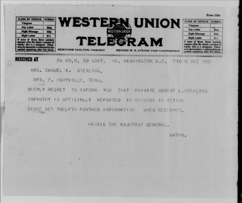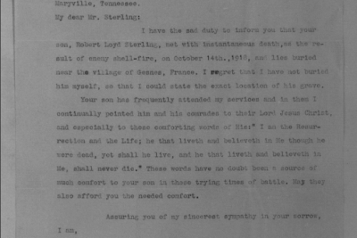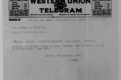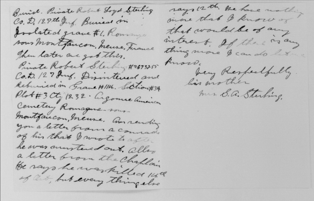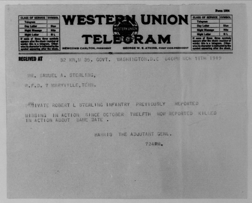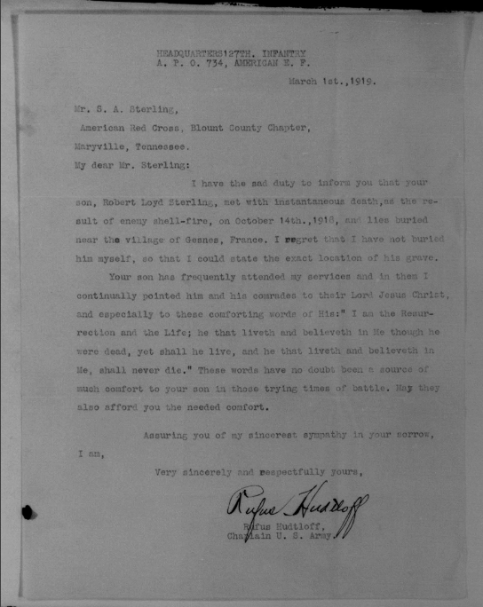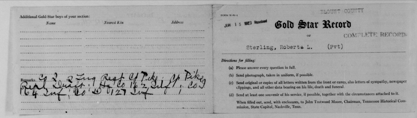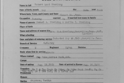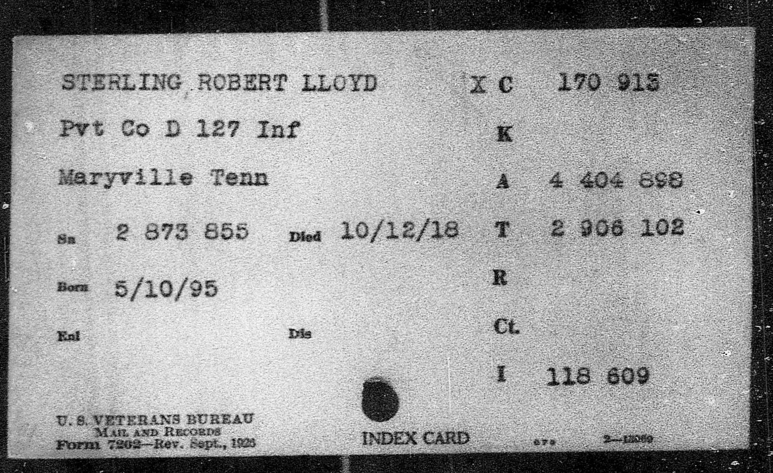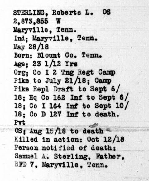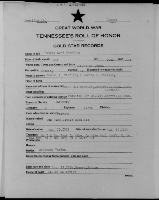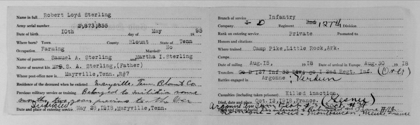 Robert Lloyd Sterling was the son of Samuel A. and Martha I. Sterling. He was a farmer before he entered the service on 28 May 1918 at Maryville, TN. He received his training at Camp Pike in Little Rock, Arkansas and sailed to Europe August 15th. He was killed in action at Gesnes in France and initially buried in an isolated grave #1 at Romagne and later reinterred at Meuse-Argonne American Cemetery.