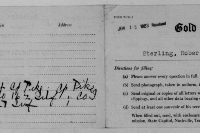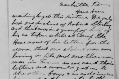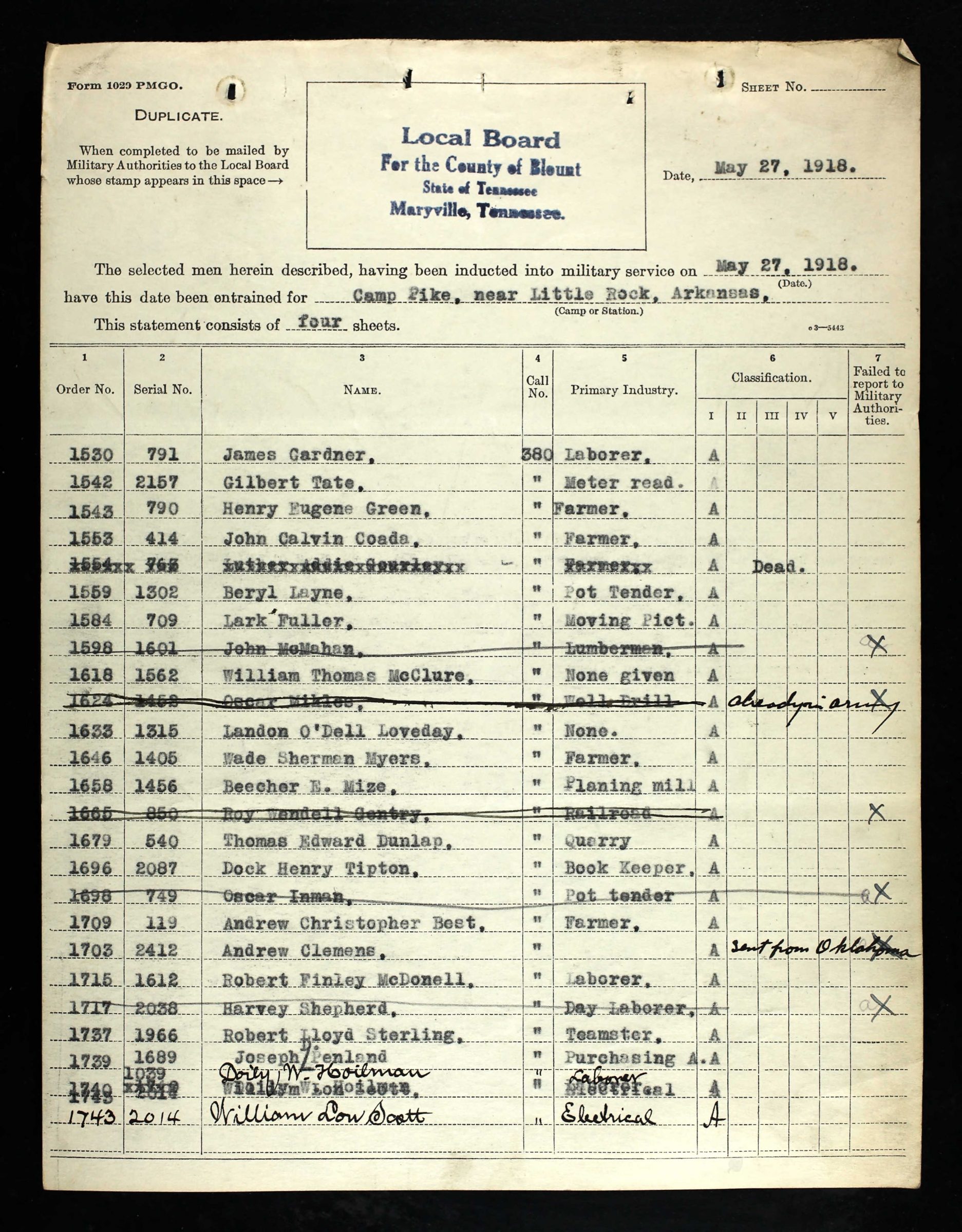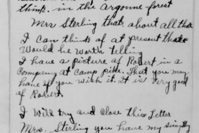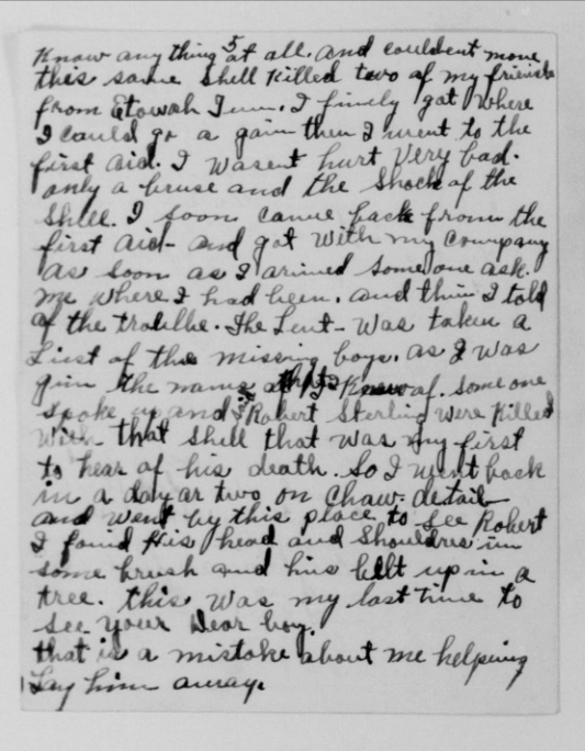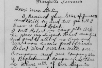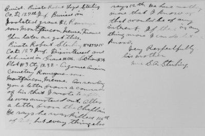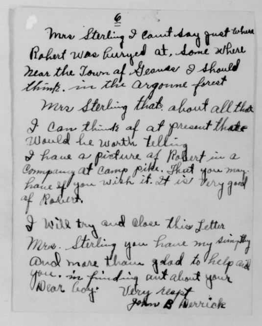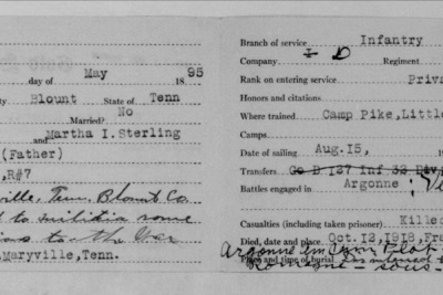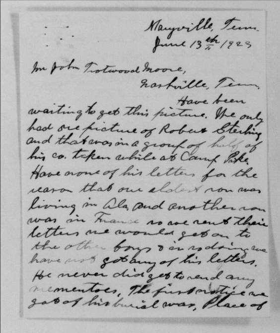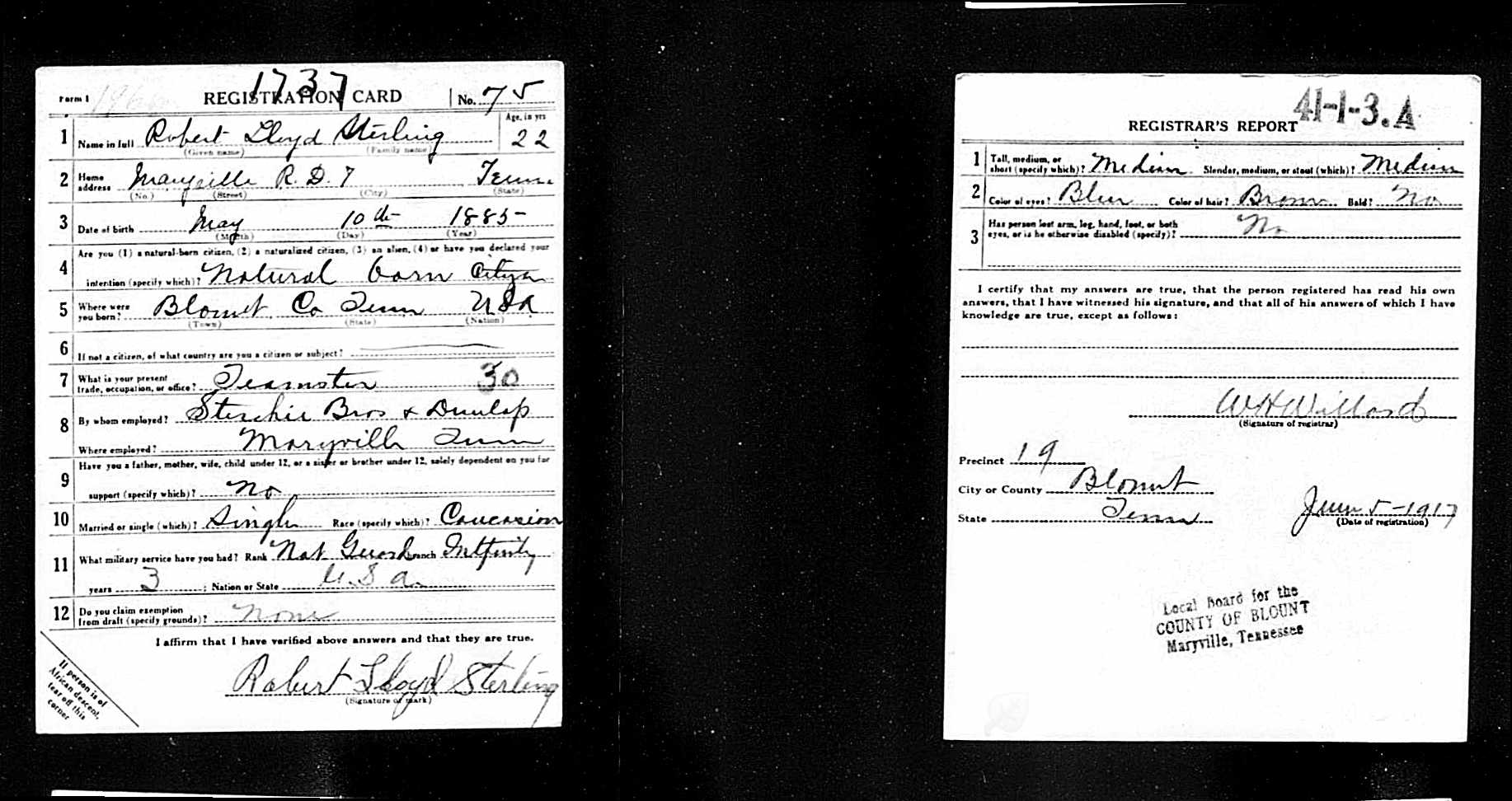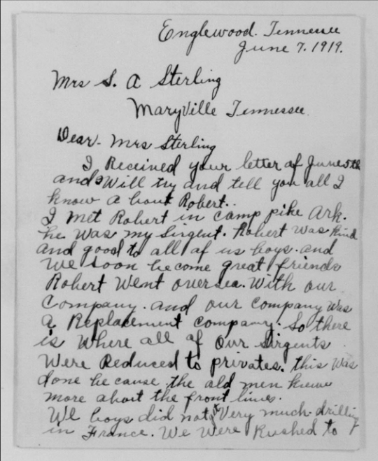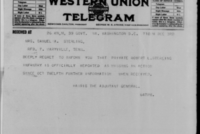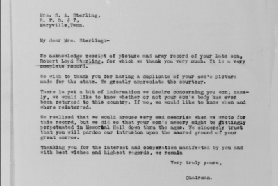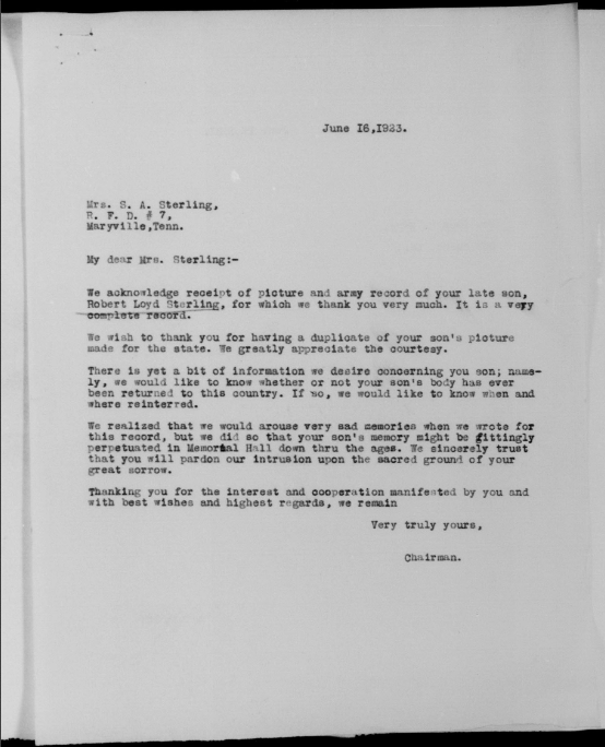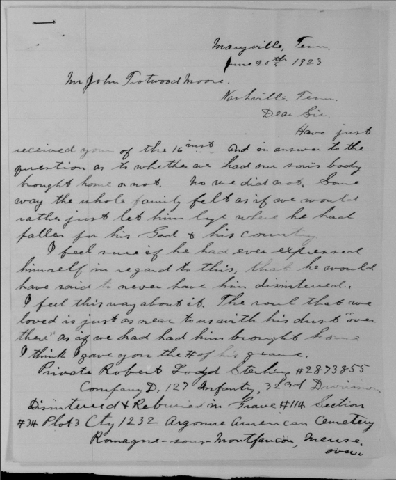 Robert Lloyd Sterling was the son of Samuel A. and Martha I. Sterling. He was a farmer before he entered the service on 28 May 1918 at Maryville, TN. He received his training at Camp Pike in Little Rock, Arkansas and sailed to Europe August 15th. He was killed in action at Gesnes in France and initially buried in an isolated grave #1 at Romagne and later reinterred at Meuse-Argonne American Cemetery.
