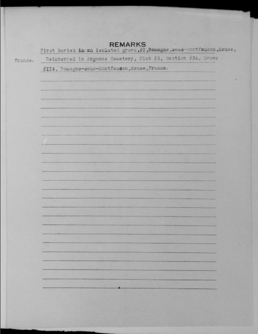 - Burial/Memorial Location: Meuse-Argonne American Cemetery, Romagne, France