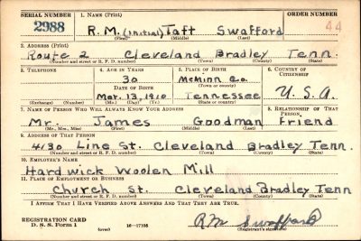 Roy M. “Taft”Swafford was the son of George Washington Swafford and Ada Bell Millwood. Husband of Dora Mae Gibson and father of Paul Swafford and Glen Roy Swafford. He is buried at the Lorraine American Cemetery, St. Avold, France, C, 12, 48