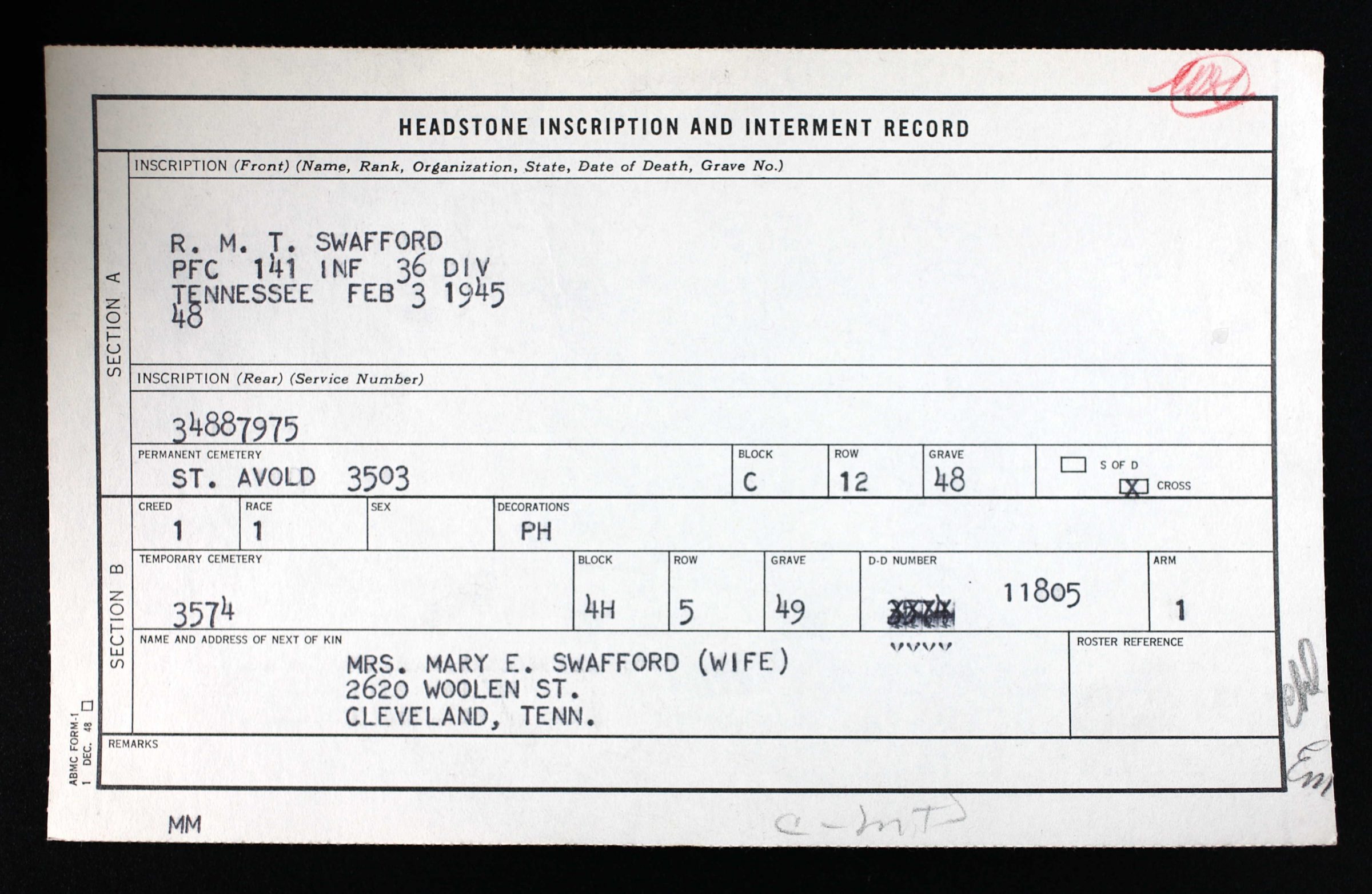 Roy M. “Taft”Swafford was the son of George Washington Swafford and Ada Bell Millwood. Husband of Dora Mae Gibson and father of Paul Swafford and Glen Roy Swafford. He is buried at the Lorraine American Cemetery, St. Avold, France, C, 12, 48