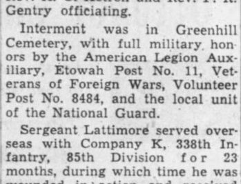 Sgt. Lattimore was returned to his hometown and laid to rest at Green Hill Cemetery in Etowah.