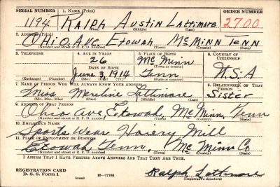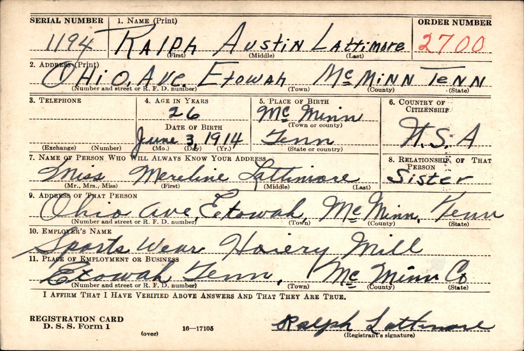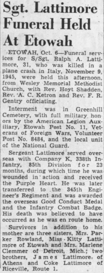 Sgt Ralph Lattimore, 31, died November 9 of injuries sustained in an airplane crash in Sicily, according to a telegram from the War Department to his parents, Mr. and Mrs. P.H. Lattimore of Etowah. Sgt. Lattimore was en route from Athens to Naples when the plane crashed during an emergency landing in Sicily.