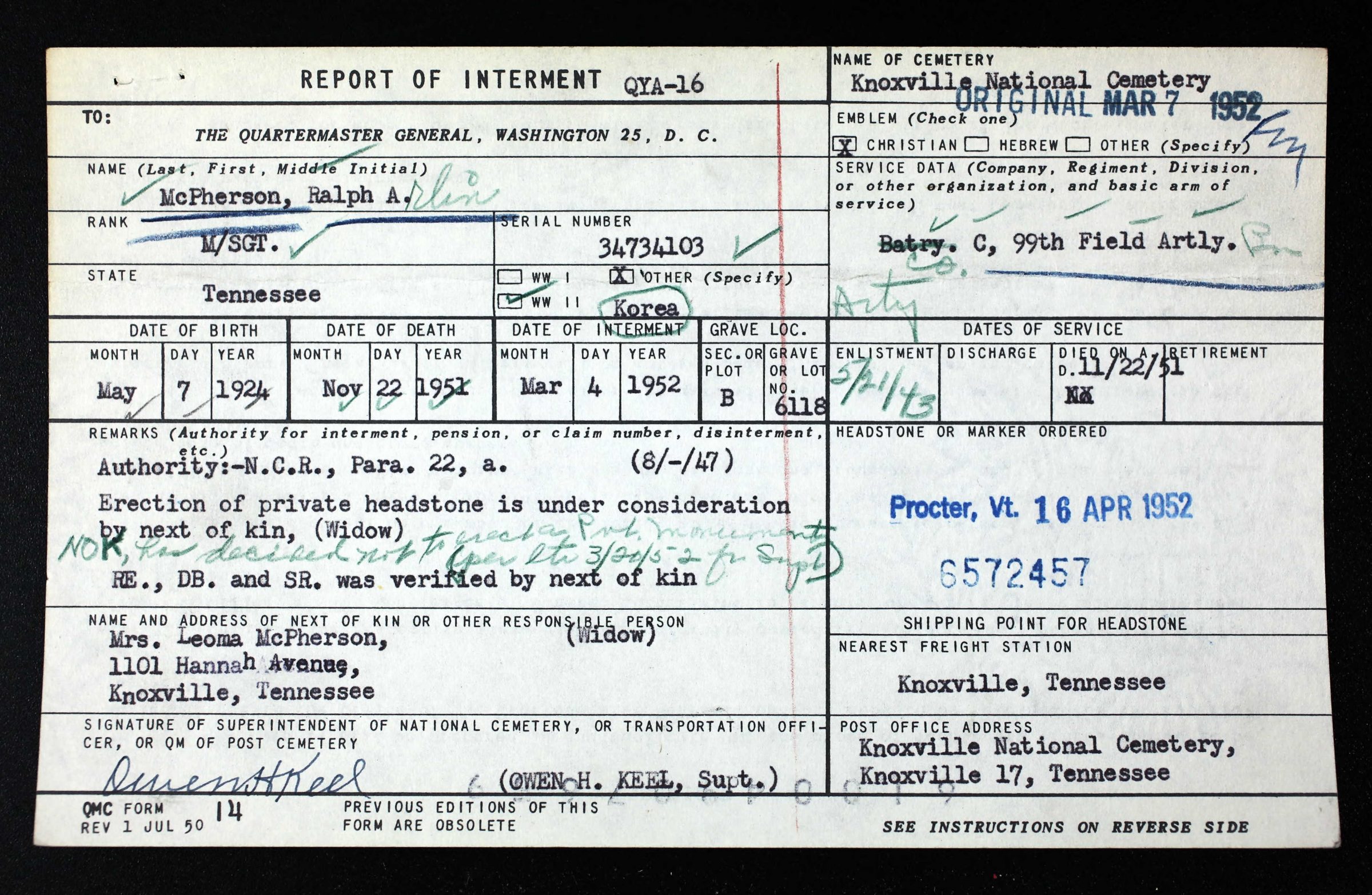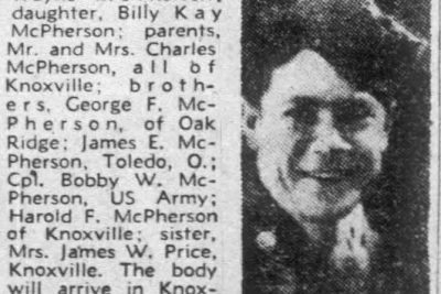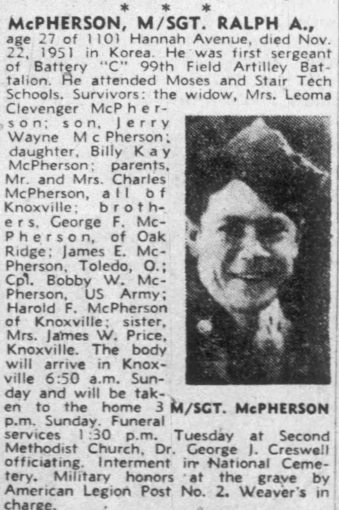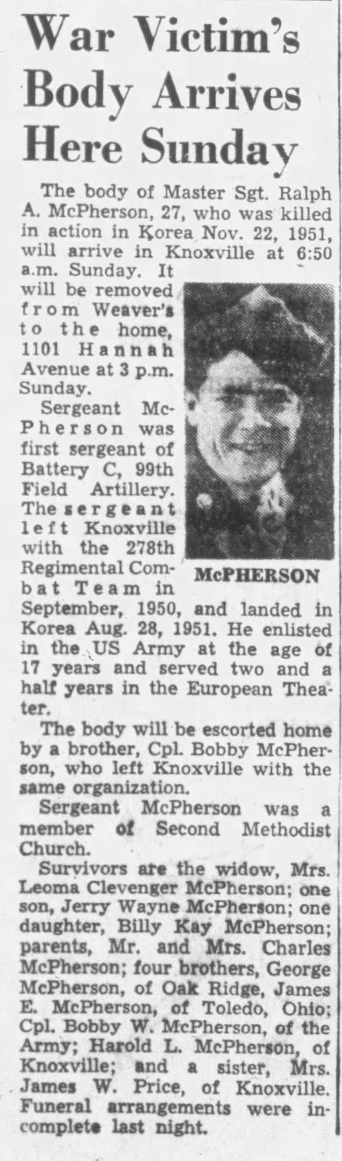 The body of Master Sgt. Ralph A. McPherson, 27, who was killed in action in Korea Nov. 22, 1951, will arrive in Knoxville at 6:50 a.m. Sunday. It will be removed from Weaver’s to the home, 1101 Hannah Avenue. Sergeant McPherson was first sergeant of Battery C, 99th Field Artillery. The sergeant left Knoxville with the 278th Regimental Combat Team in September, 1950, and landed in Korea Aug. 28, 1951. He enlisted in the US Army at the age of 17 years and served two and a half years in the European theater. The body will be escorted home by a brother, Cpl. Bobby McPherson, who left Knoxville with the same organization. Sergeant McPherson was a member of Second Methodist Church. Survivors are the widow, Mrs. Leoma Clevenger McPherson; one daughter, Billy Kay McPherson; parents, Mr. and Mrs. Charles McPherson; four brothers, George McPherson, of Oak Ridge, James E. McPherson of Toledo, Ohio; Cpl. Bobby W. McPherson of the Army; Harold L. McPherson of Knoxville; and a sister, Mrs. James W. Price, of Knoxville.
