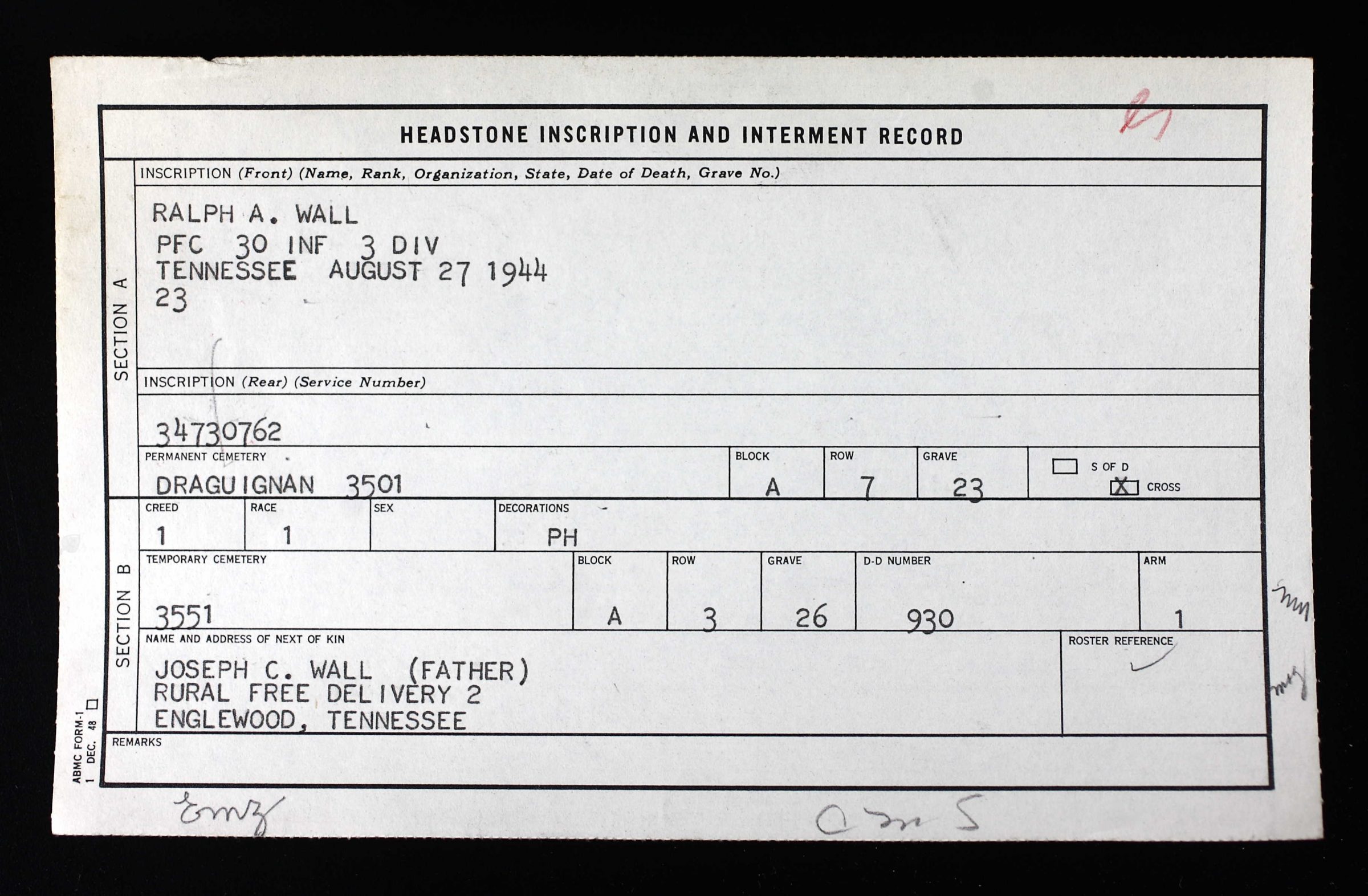 He was killed in action and initially buried at Luynes Cemetery at Aix-En-Provence, France and reburied at Rhone American Cemetery, Draguignan (Var), France, A, 7, 23