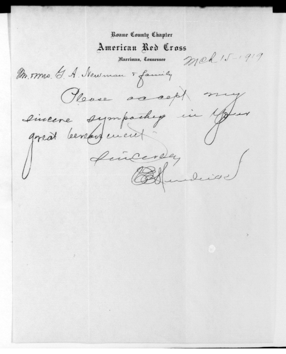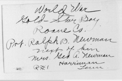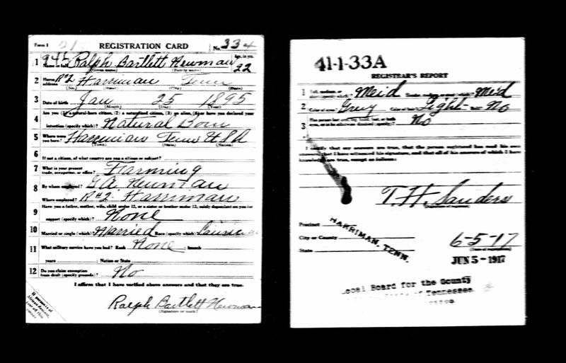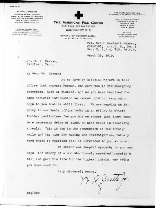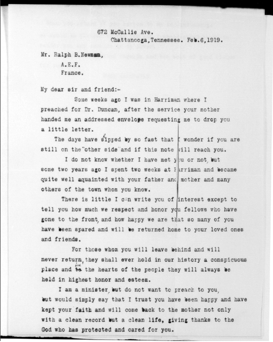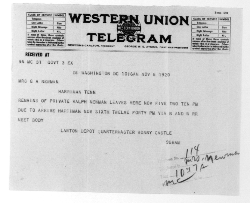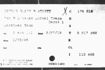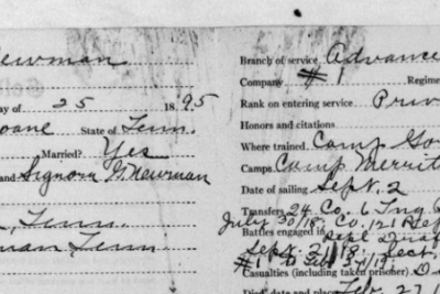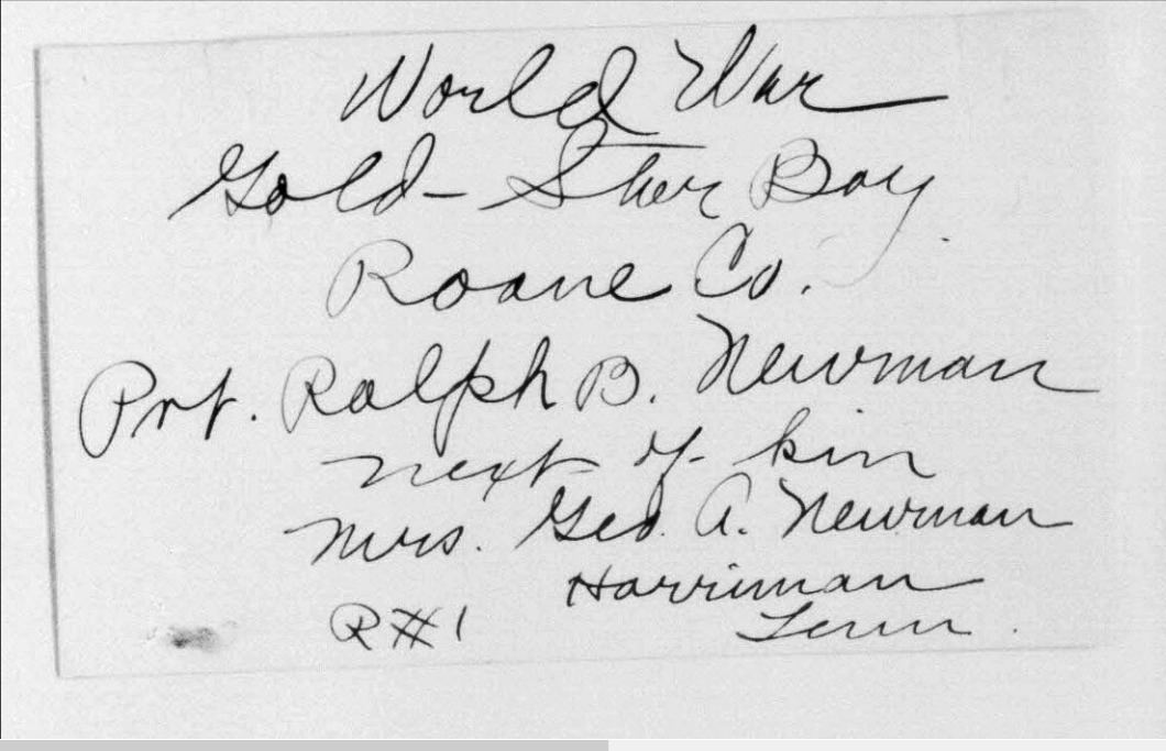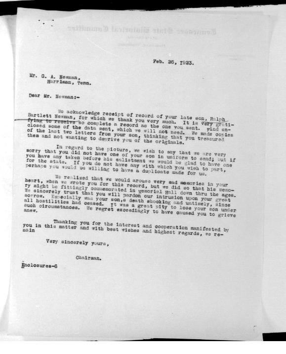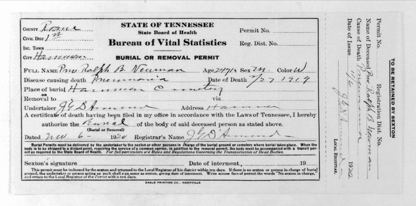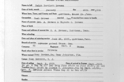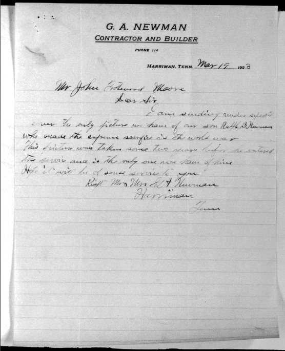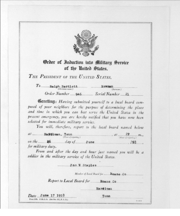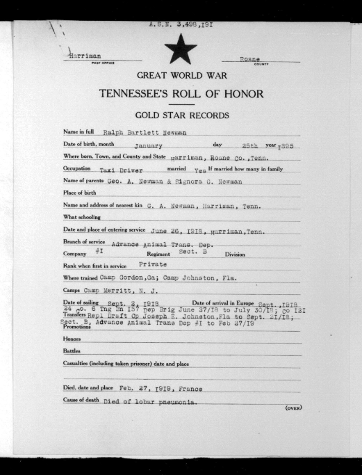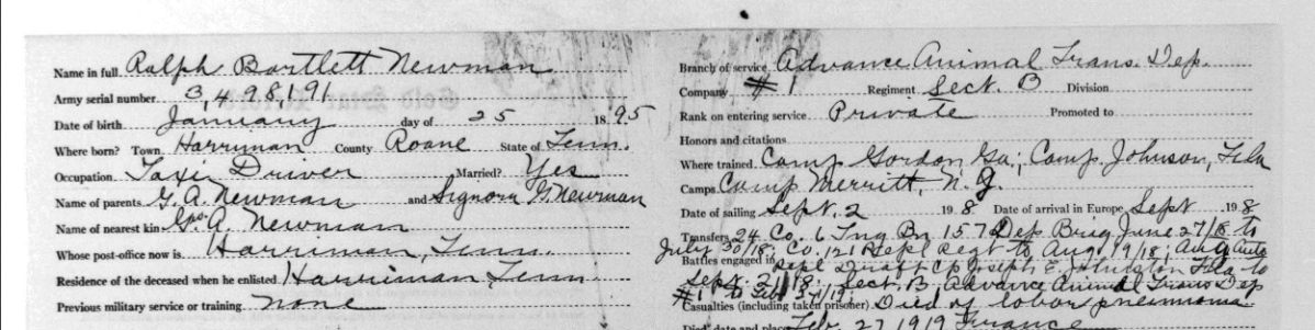 Ralph Bartlett Newman was born 25 June 1895, Harriman, Tennessee. He was inducted into military service on 27 June 1918 at Camp Gordon, Georgia. He was an auto-driver prior to his induction.