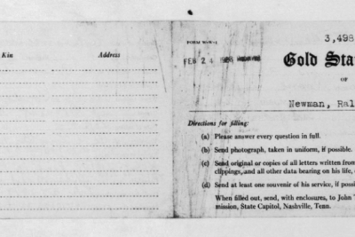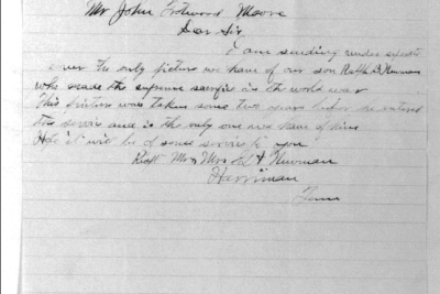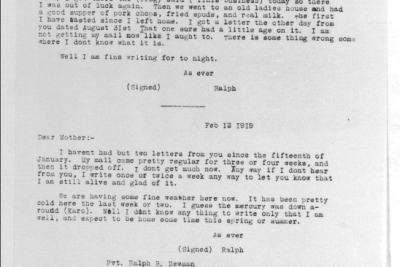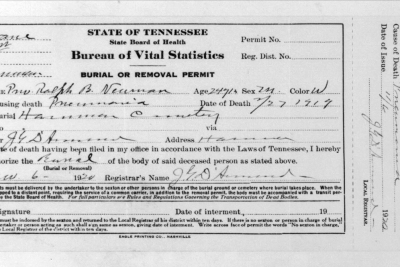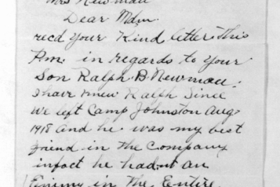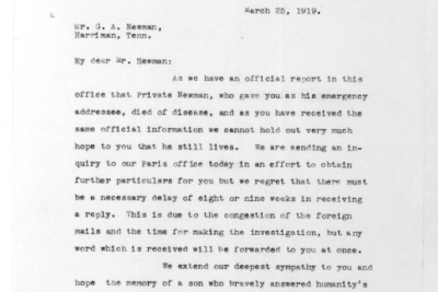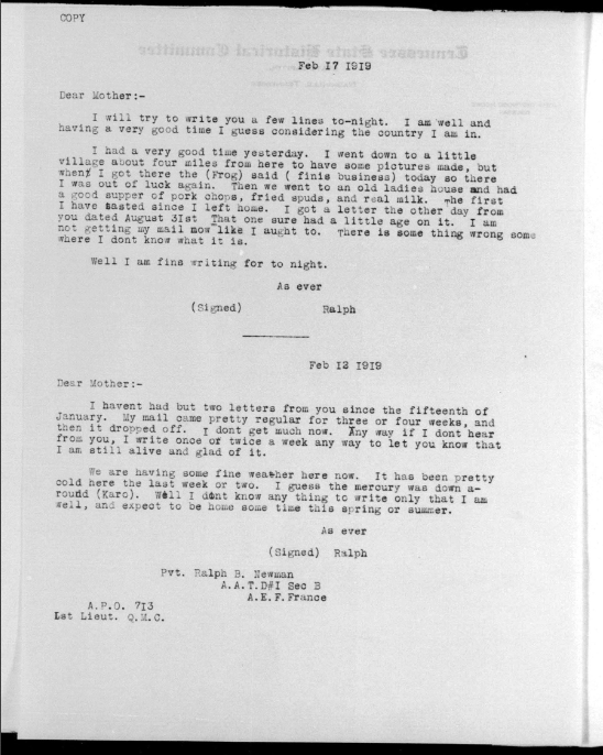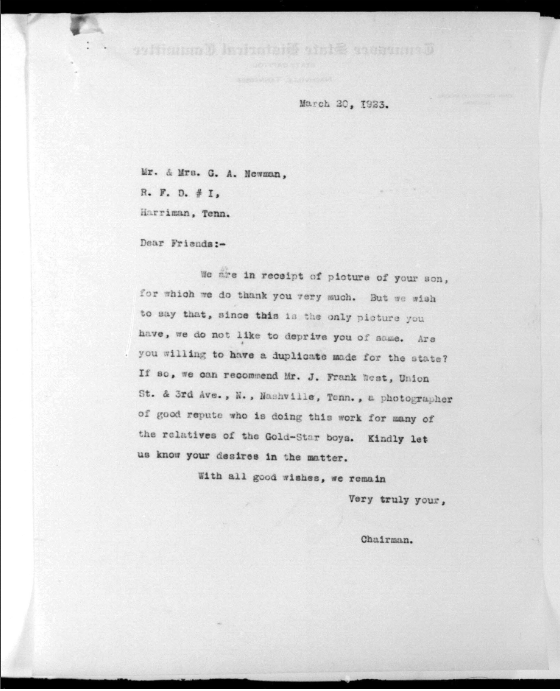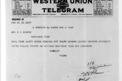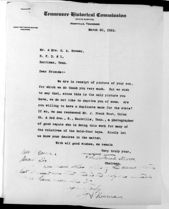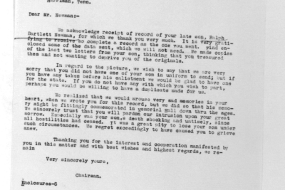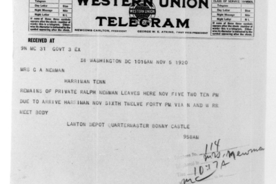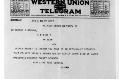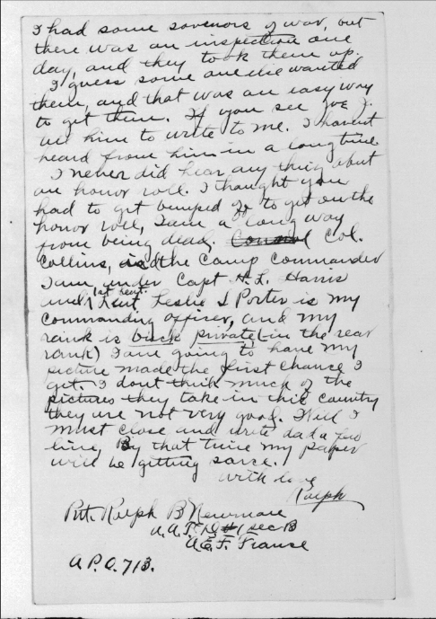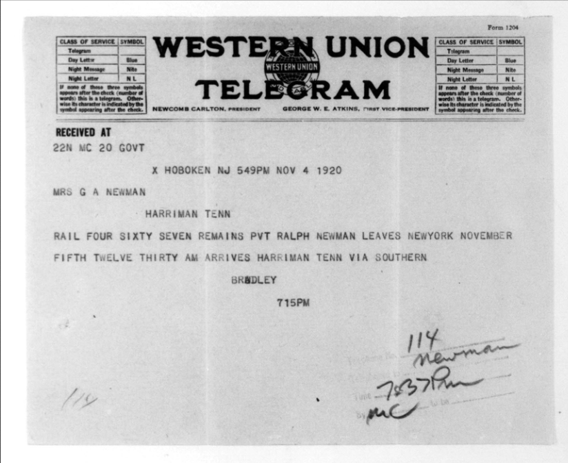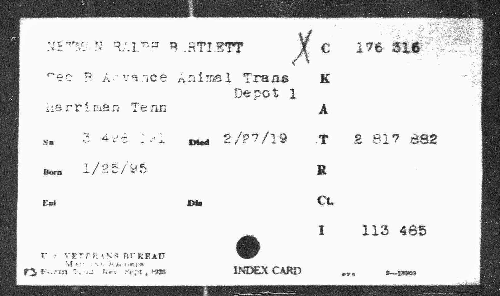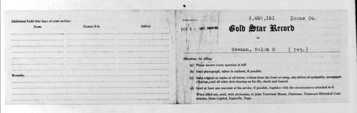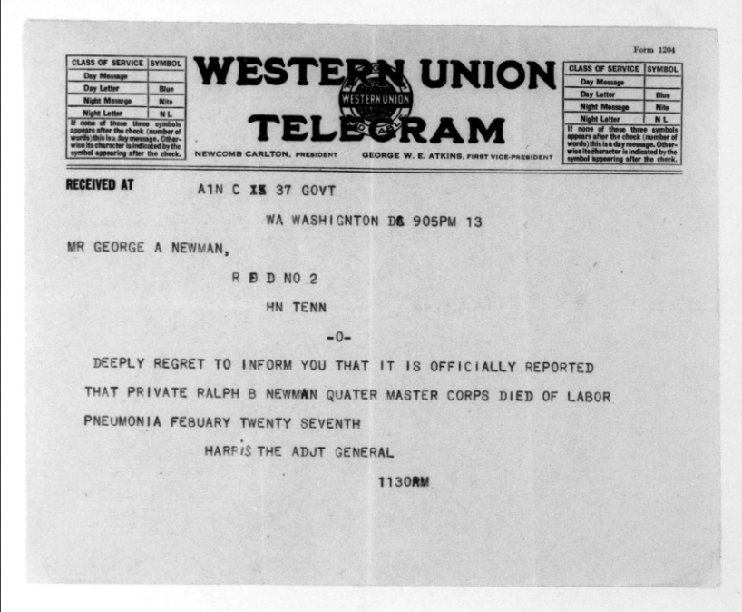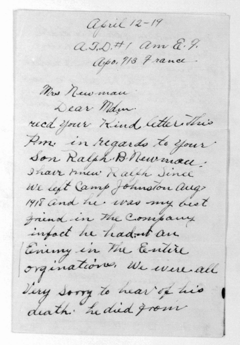 Ralph Bartlett Newman was born 25 June 1895, Harriman, Tennessee. He was inducted into military service on 27 June 1918 at Camp Gordon, Georgia. He was an auto-driver prior to his induction.