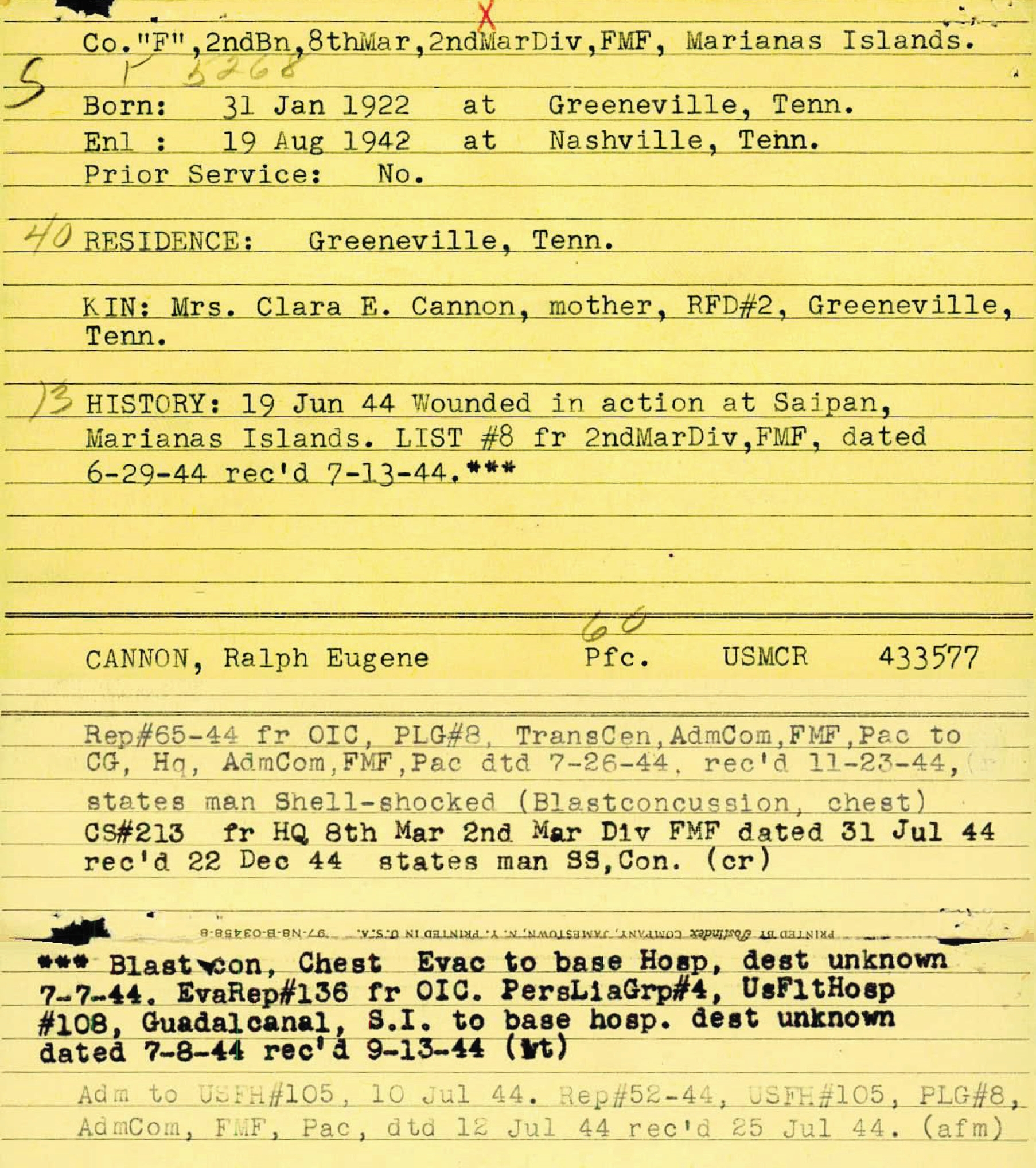 Relatives of Pfc. Cannon, who belonged to the Second Marine Division and was wounded in the battle of Saipan, did not know that he had returned to his outfit. After he was wounded he was removed to a hospital at New Caledonia, and it was thought that he was still there in a rest camp, until they received the death message yesterday.