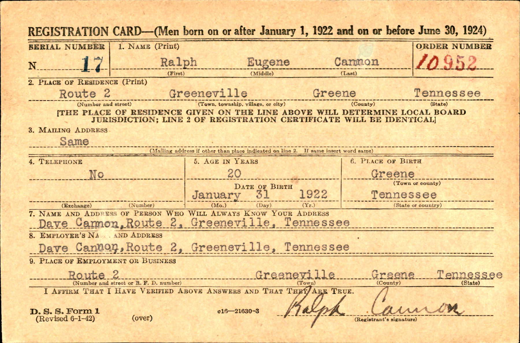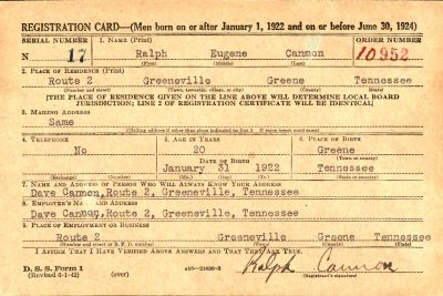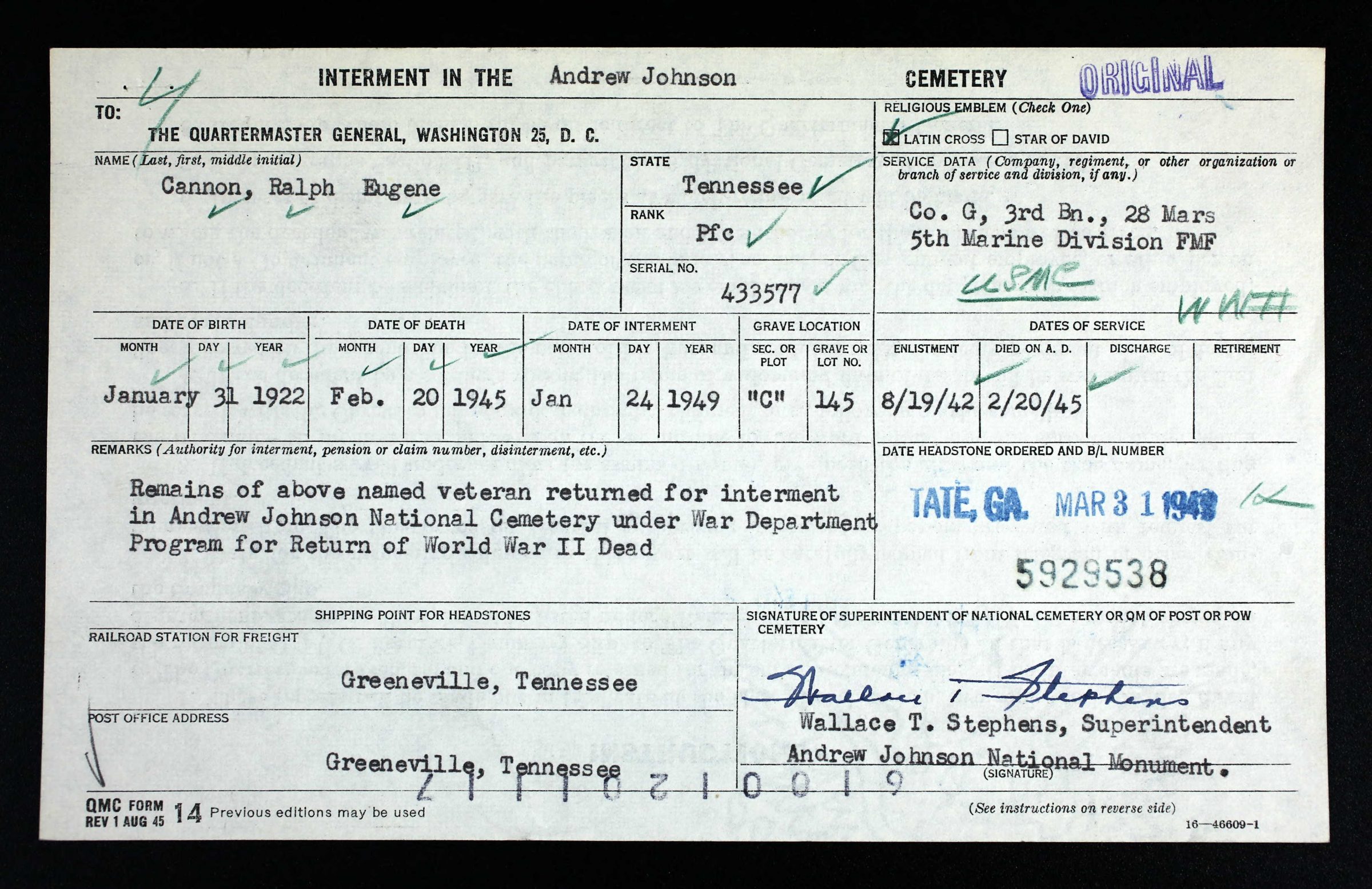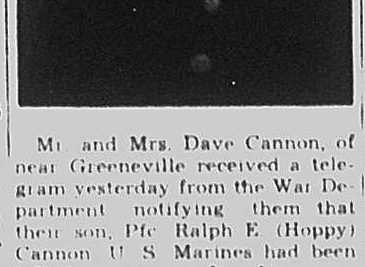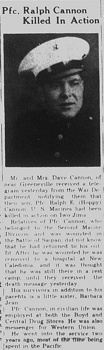 Mr. and Mrs. Dave Cannon of near Greeneville received a telegram yesterday from the War Department notifying them that their son, Pfc. Ralph E. (Hoppy) Cannon, U.S. Marines had been killed in action on Iwo Jima.