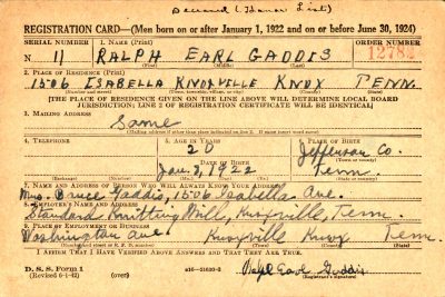 PFC Ralph Earl Gaddis was born in Jefferson County, TN, but grew up in Knoxville. His parents were Bruce W. Gaddis and Allie Moore Gaddis. He was the oldest of three children. He is survived by brother, Ret. Bgd. General Norman C. Gaddis, and sister, Opal Gaddis Suddarth.