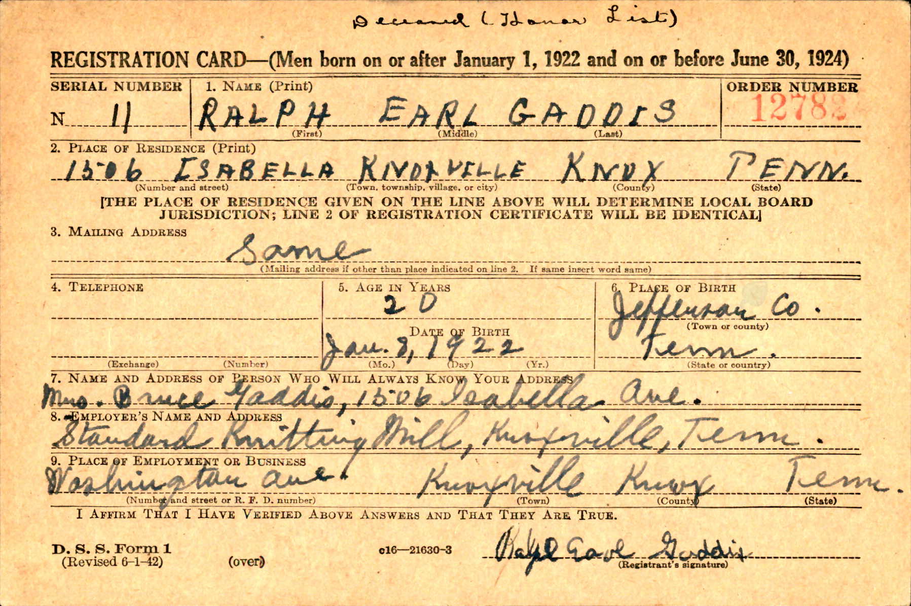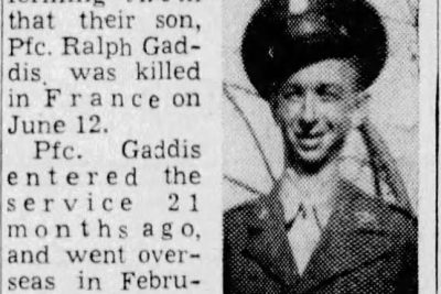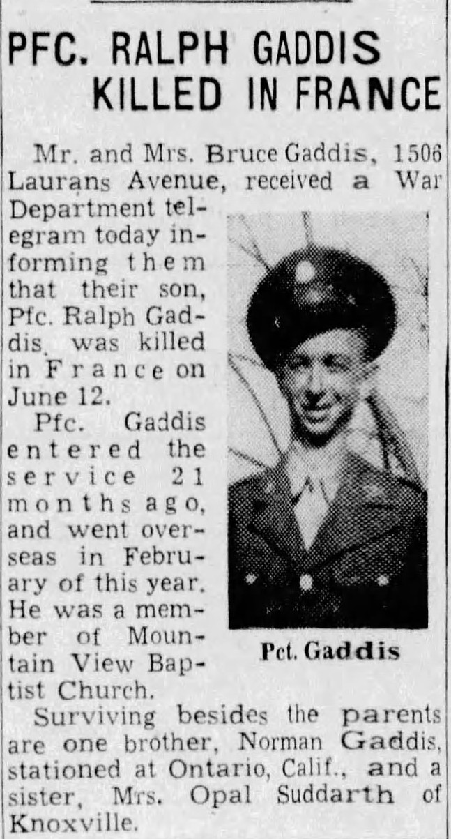 Ralph Earl Gaddis served in the 90th Infantry Division and took part in the D-Day landings at Utah Beach. He was killed at Ste-Mère-Eglise on June 12, 1944. He enlisted on October 12, 1942, in Fort Oglethorpe, GA