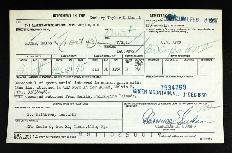 T/Sgt Moore was returned from Manila, Philippine Islands. He is buried at Zachary Taylor National Cemetery, Louisville, Jefferson County in Kentucky together with Sgt William R. Dettman, PFC William A. Fussell, Corp Sigmund S. Grabowski, PFC Chester A. Turczynski, Sgt Nicholas V. Battista, T/Sgt Joseph M. Faggio, Corp John Giancone, PFC Vernon V. Leggett Jr., PFC J.T. Taylor and PFC Melvin B. Auman.