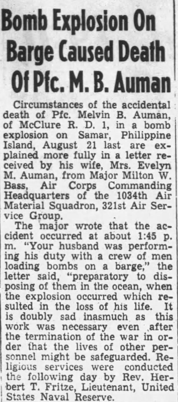 Major Milton W. Bass, Air Corps Commanding Headquarters of the 1034th Air Material Squadron, 321st Air Service Group wrote in a letter to Mrs. Evelyn M. Auman, the wife of Pfc. Melvin B. Auman that a crew of men loading bombs on a barge, preparatory to disposing of them in the ocean, when the explosion occurred which resulted in the loss of members of this group. Religious services were conducted the following day by Rev. Herbert T. Fritze, Lieutenant, United States Naval Reserve.
