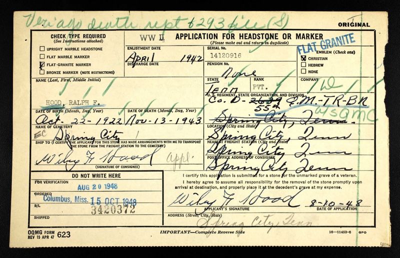 Ralph Hood was born 22 October 1922, the son of Wiley Franklin Hood and Tressie Hilliard.
