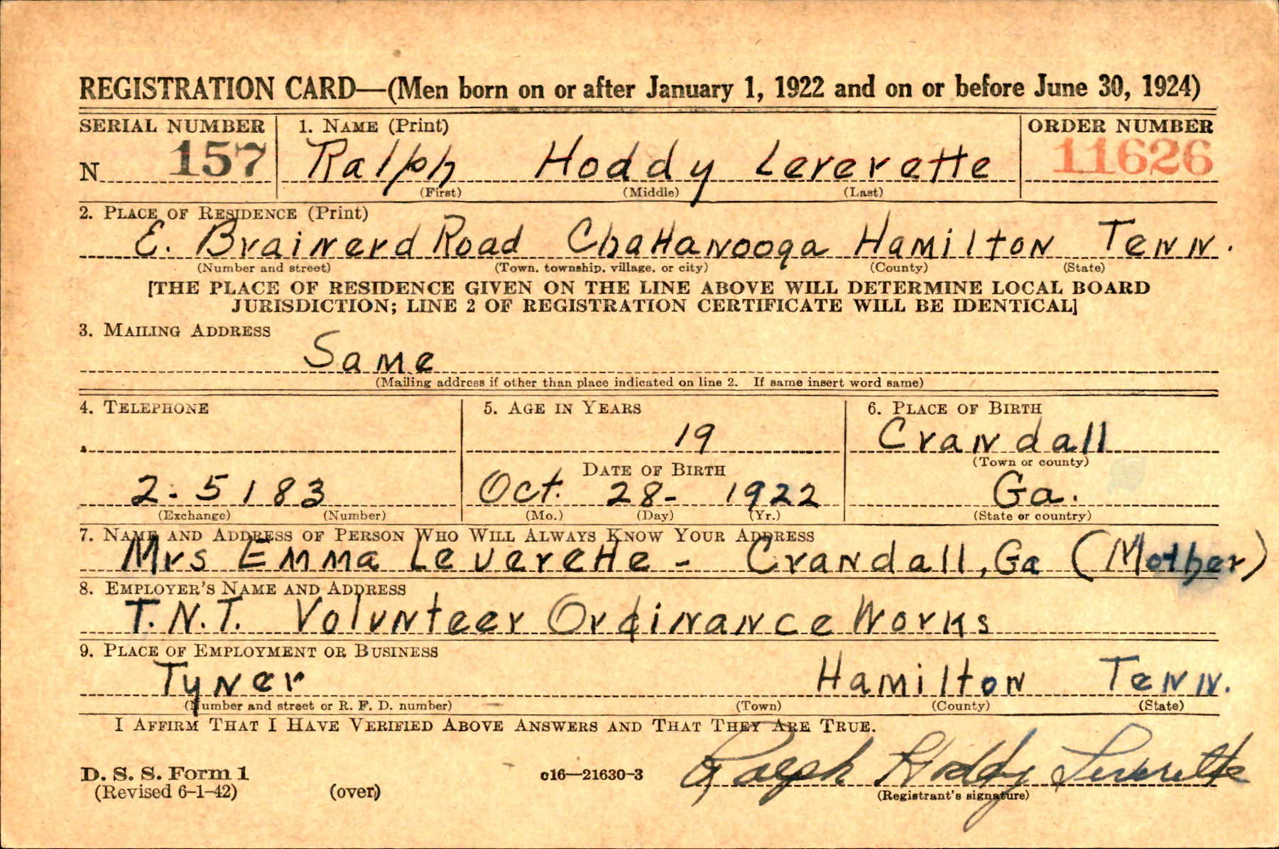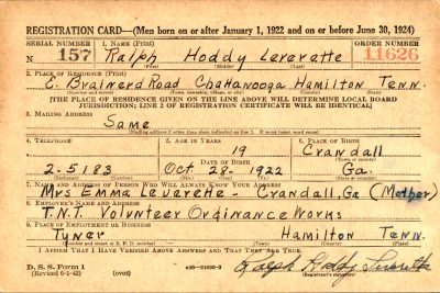Corporal Ralph Hoddy Leverette was born on 28 October 1922 at Crandall, Georgia, the son of Paul Ranson Leverette and Emma J Simpson.