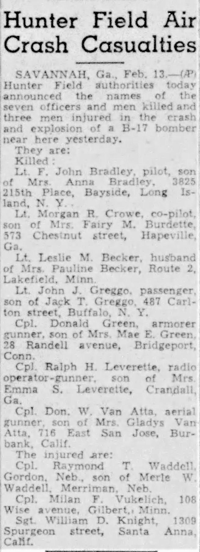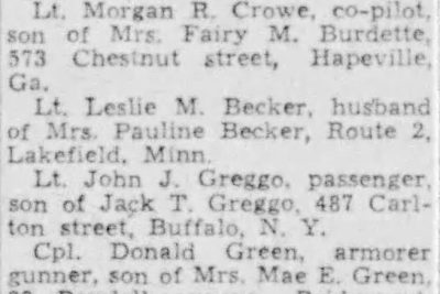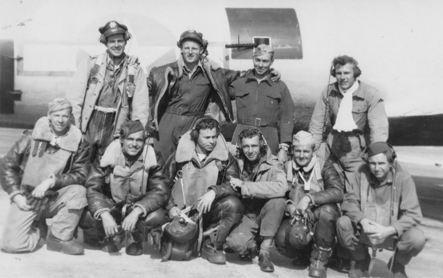 Top row (l-r) – 2nd Lt. John Bradley, Pilot; 2nd Lt. M. Robert Crowe, Co-Pilot; 2nd Lt. Leslie Becker, Navigator; 2nd Lt. Edgar Guest, Bombardier.