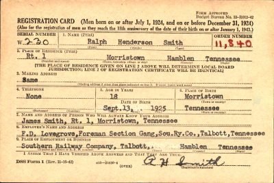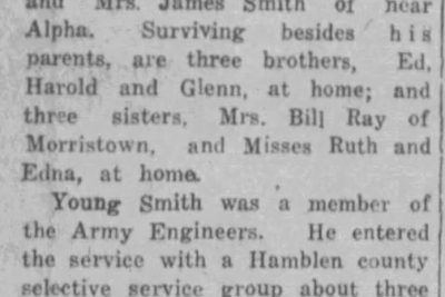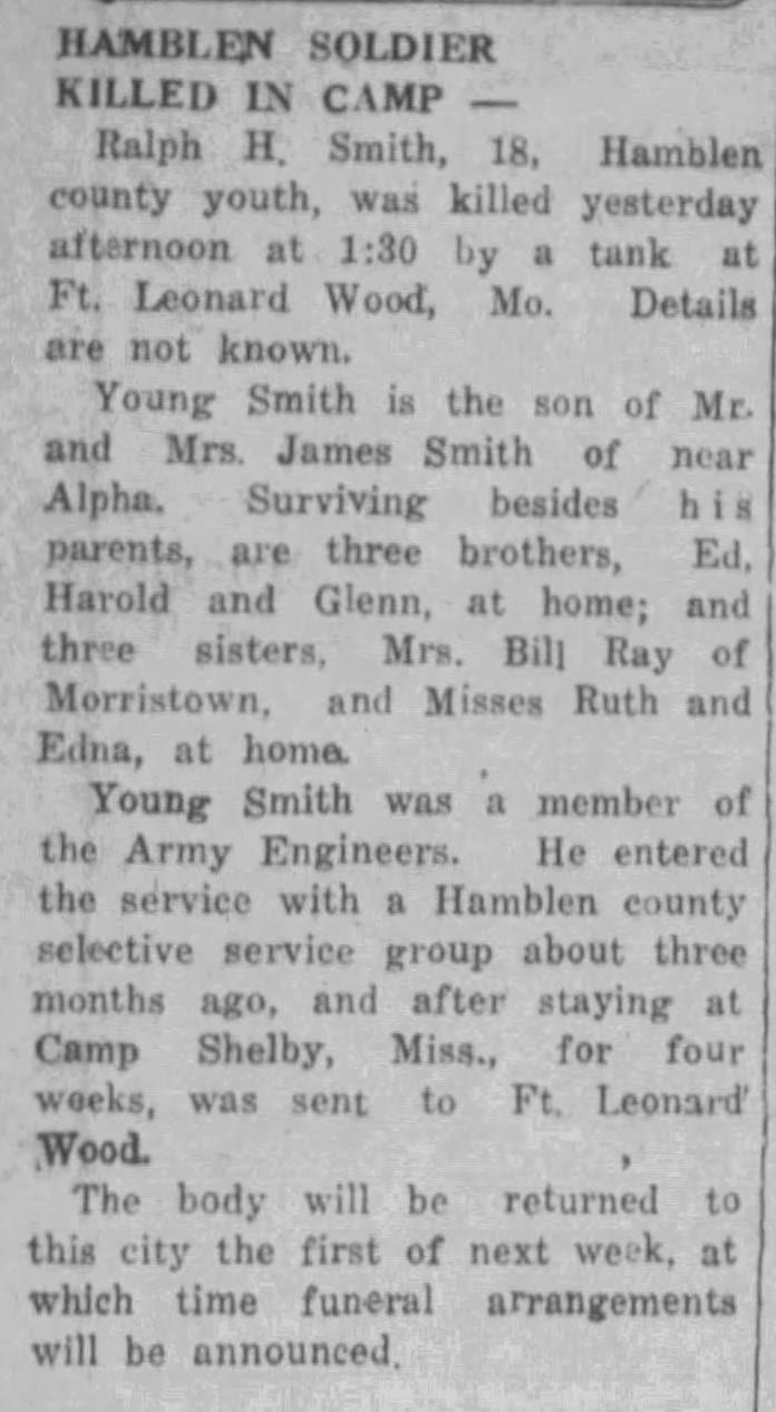Ralph H. Smith, 18, Hamblen county youth, was killed yesterday afternoon by a tank at Ft. Leonard Wood, Mo. Details are not known. Young smith is the son of Mr. and Mrs. James Smith of near Alpha. Surviving besides his parents, are three brothers, Ed, Harold and Glenn, at home; and three sisters, Mrs. Bill Ray of Morristown, and Misses Ruth and Edna at home. Young Smith was a member of the Army Engineers. He entered the service with a Hamblen County selective service group about three months ago, and after staying at Camp Shelby, Miss., for four weeks, was sent to Ft. Leonard Wood.
