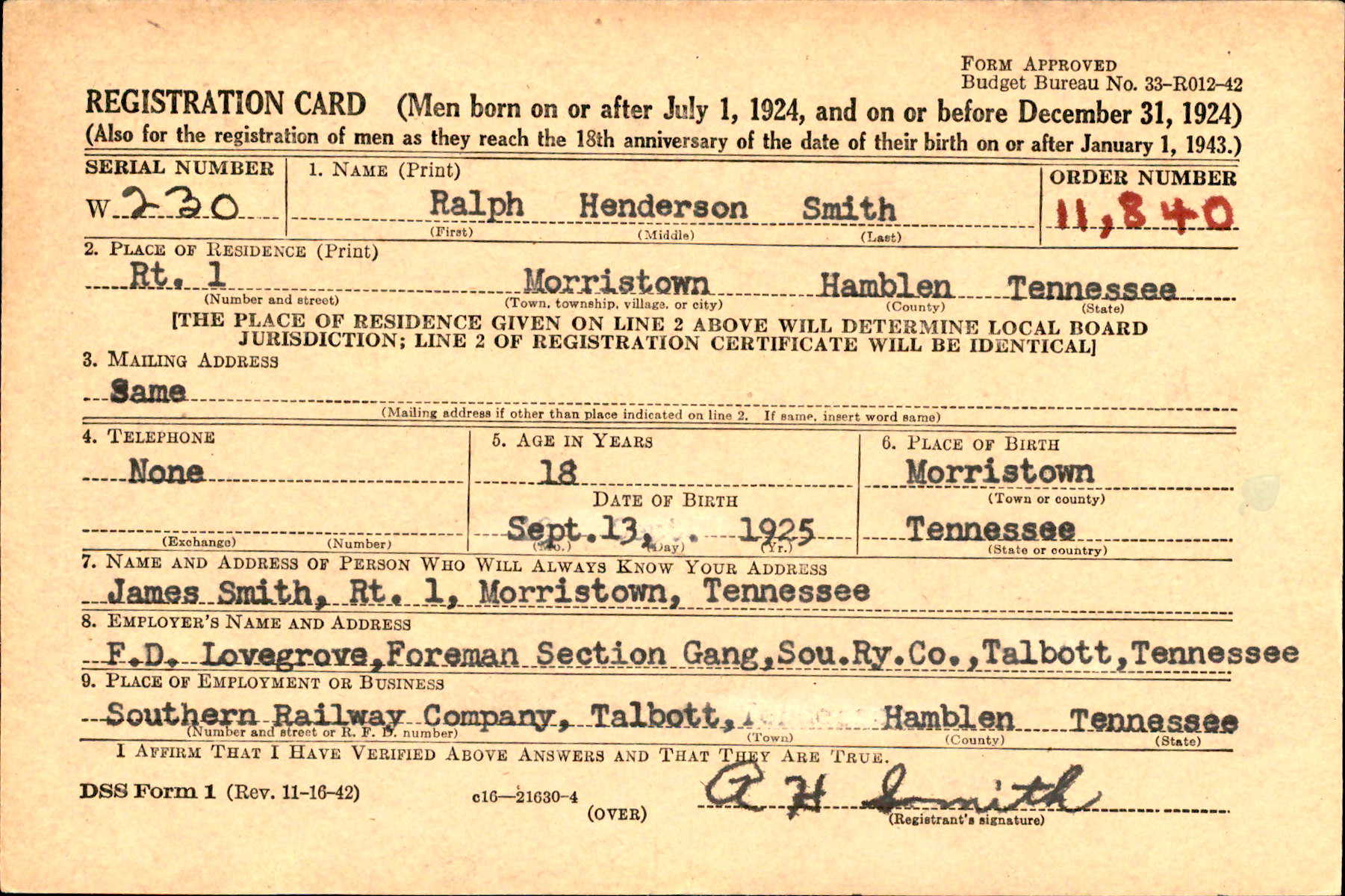 Ralph Henderson Smith was born at Morristown, Tennessee, the son of James Smith and Georgie Johnson.