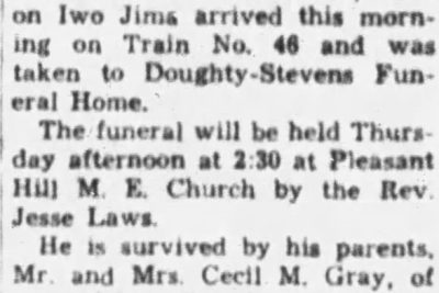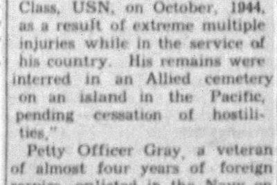 Petty Officer Gray, a veteran of almost four years of foreign service enlisted in the Navy on his twenty-first birthday. After nine weeks of boot training at Norfolk, Va., he was assigned to sea duty and spent two years in the Atlantic. He was then transferred to the Pacific and had been in that theater of war for the past twenty months. He was in the Merchant Marine. The last letter received by his family was written on October 18.