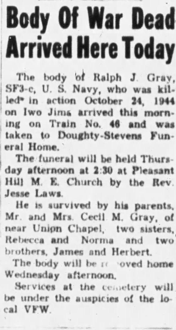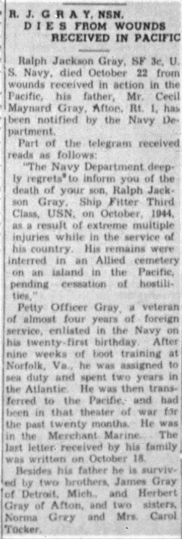 Ralph Jackson Gray, SF 3c, U.S. Navy, died October 22 from wounds received in action in the Pacific, his father, Mrs. Cecil Maynard Gray, Afton, Rt. 1, has been notified by the Navy Department. Part of the telegram received reads as follow: “The Navy Department deeply regrets to inform you of the death of your son, Ralph Jackson Gray, Ship Fitter Third Class, USN, on October, 1944, as a result of extreme multiple injuries while in the service of his country. His remains were interred in an Allied cemetery on an island in the Pacific, pending cessation of hostilities.”