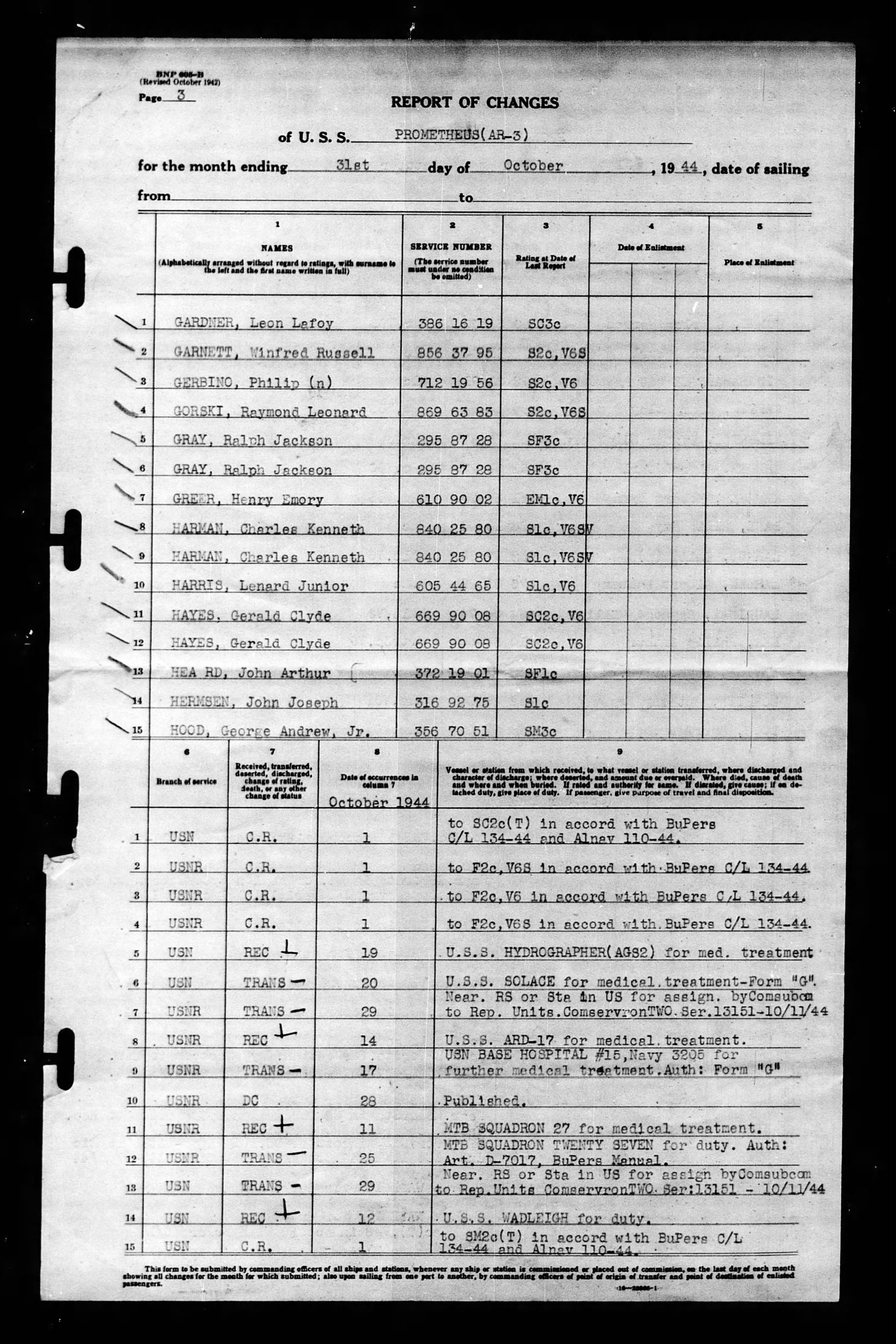 - Division/Assignment: U.S.S. Prometheus (AR-3)