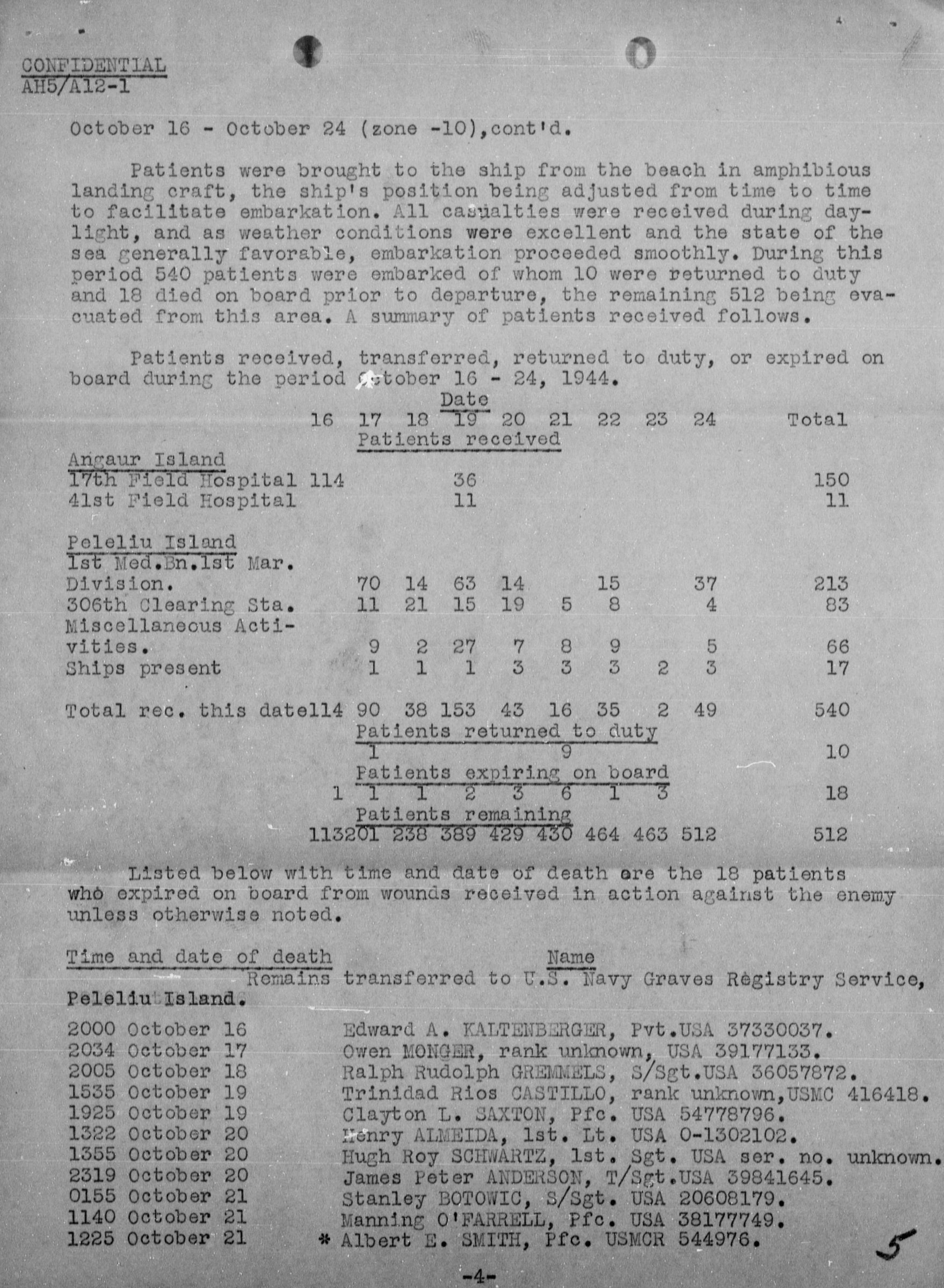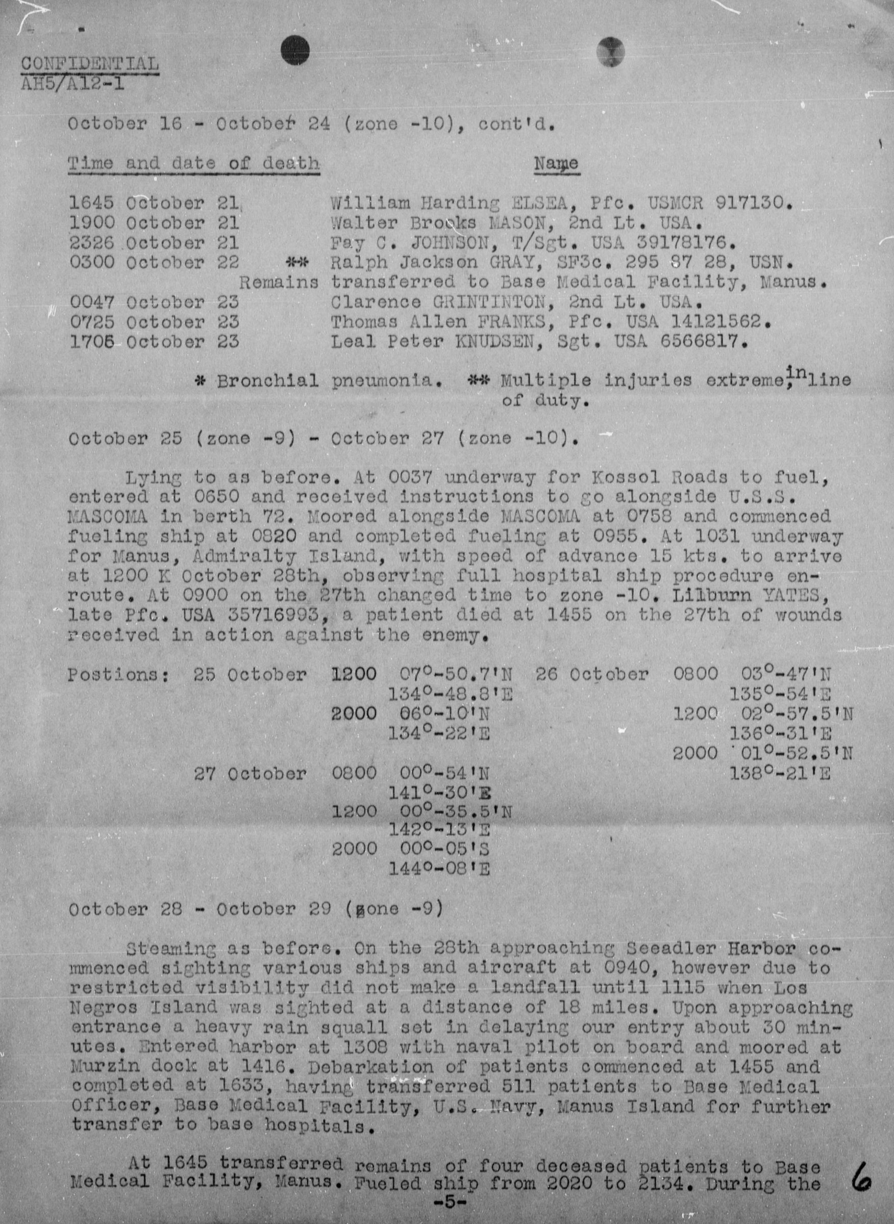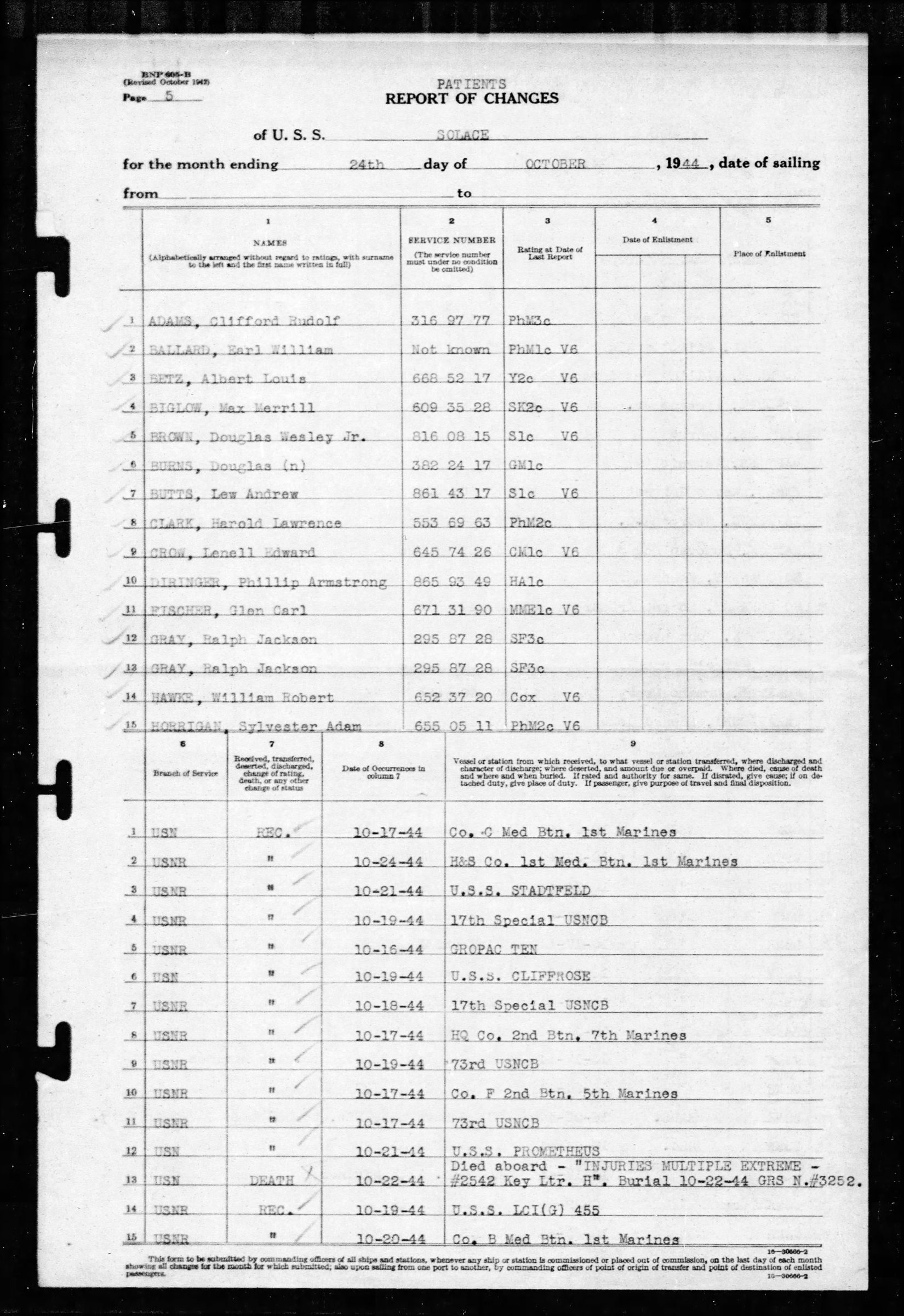 He was killed in the South Pacific. He served on the U.S.S. Prometheus and was transferred to the U.S.S. Solace for medical treatment on 20 October 1944. He died aboard two days later from multiple injuries, received in the line of duty.