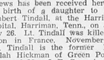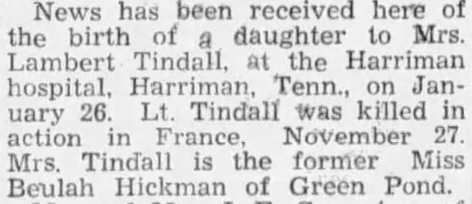 “Lt. Lambert Tindall Killed In Action. Lt. Lambert Tindall , son of Mr. and Mrs. W.R. Tindall , of 702 Clinton St., Harriman, has been killed in action in Belgium, according to a telegram received by the family from the War Department last Friday. Lt. Tindall has a wife and four sisters, one of whom is Miss Mary Elizabeth Tindall, English teacher in the Rockwood high school.”