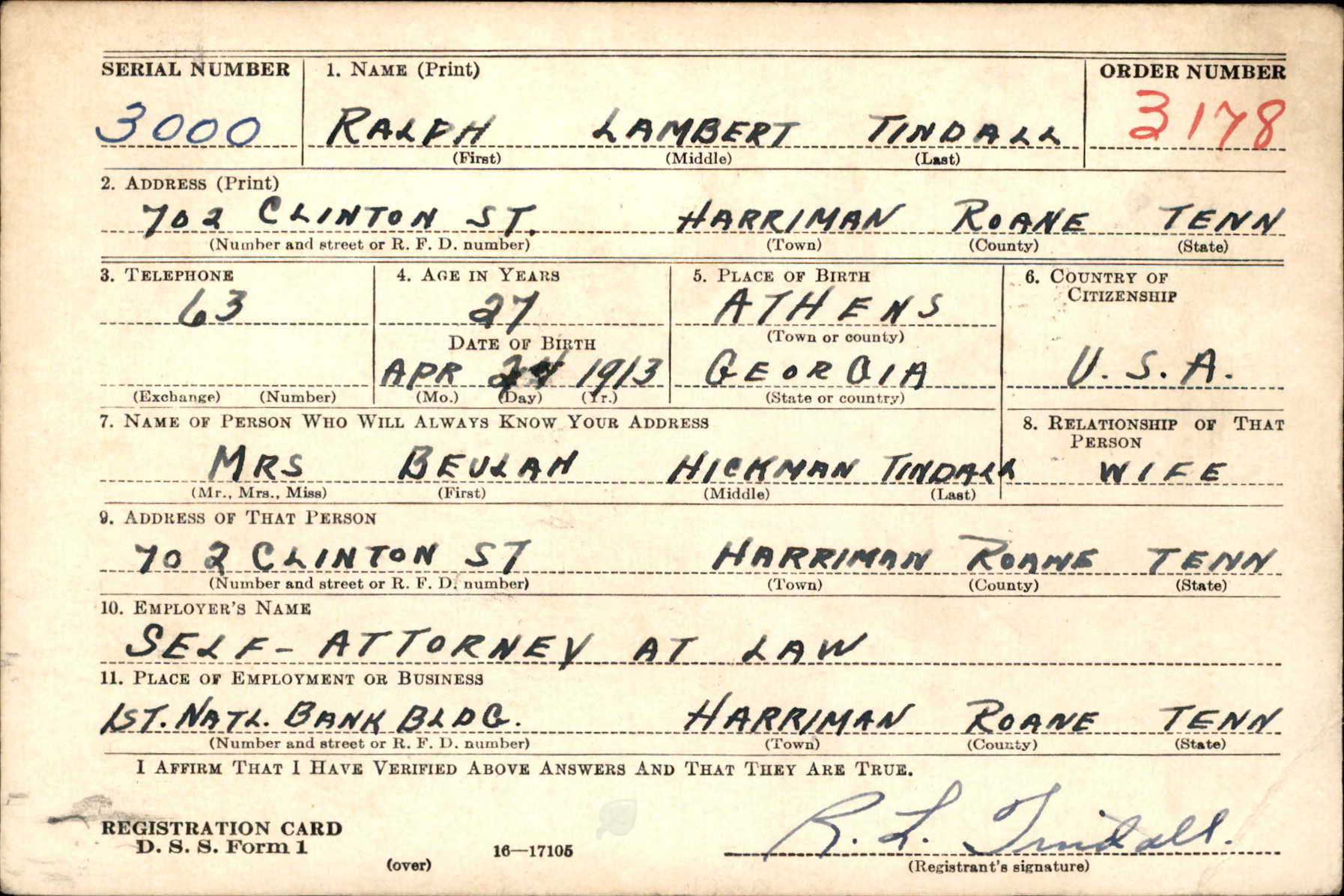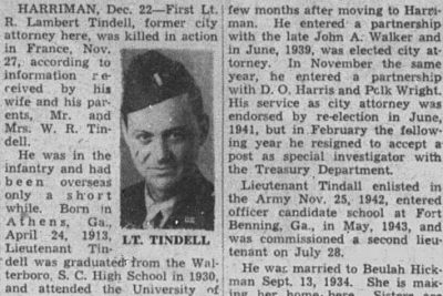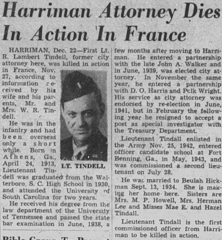 First Lieutenant R. Lambert Tindell, former city attorney here, was killed in action in France, Nov. 27, according to information received by his wife and his parents, Mr. and Mrs. W.R. Tindell. He was in the infantry and had been overseas only a short while. Born in Athens, Ga., April 24, 1913, Lieutenant Gindell was graduated from the Walterboro, S.C. High School in 1930, and attended the University of South Carolina for two years. He received his degree from the law department of the University of Tennessee and passed the state bar examination in June, 1938, a few months after moving to Harriman. He entered a partnership with the late John A. Walker and in June, 1939, was elected city attorney. In November the same year, ehe entered a partnership with D.O. Harris and Polk Wright.