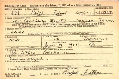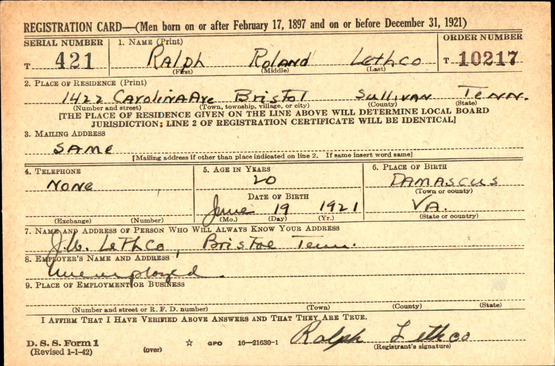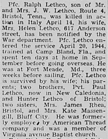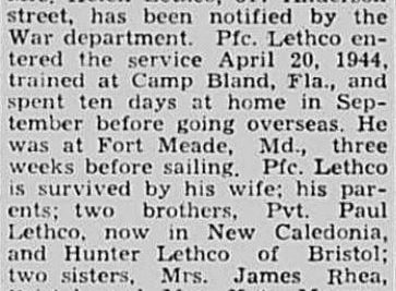 Ralph Roland Lethco was born in Virginia, the son of John William Lethco and Jeanette Trent. He married Helen Gladys Fritts in 1940. They had a one year old son Billie Harris Lethco who died in February 1944. He entered the service April 20, 1944, trained at Camp Bland in Florida and spent ten days at home in September before going overseas. He was at Fort meade in Maryland, three weeks before sailing.