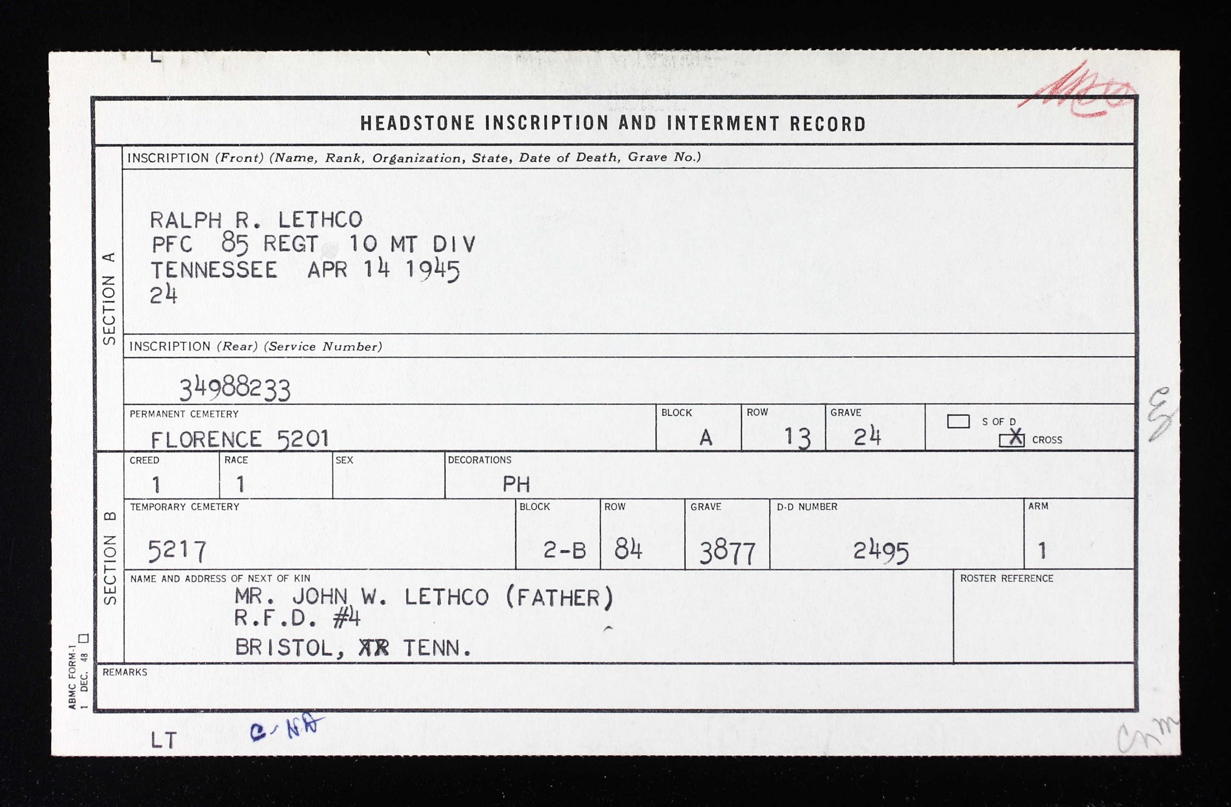 Pfc Lethco died in Italy. He was initially buried at Castelfiorentino Cemetery at Castelfiorentino, Italy and reburied at the Florence American Cemetery, Via Cassia, Italy, A, 13, 24