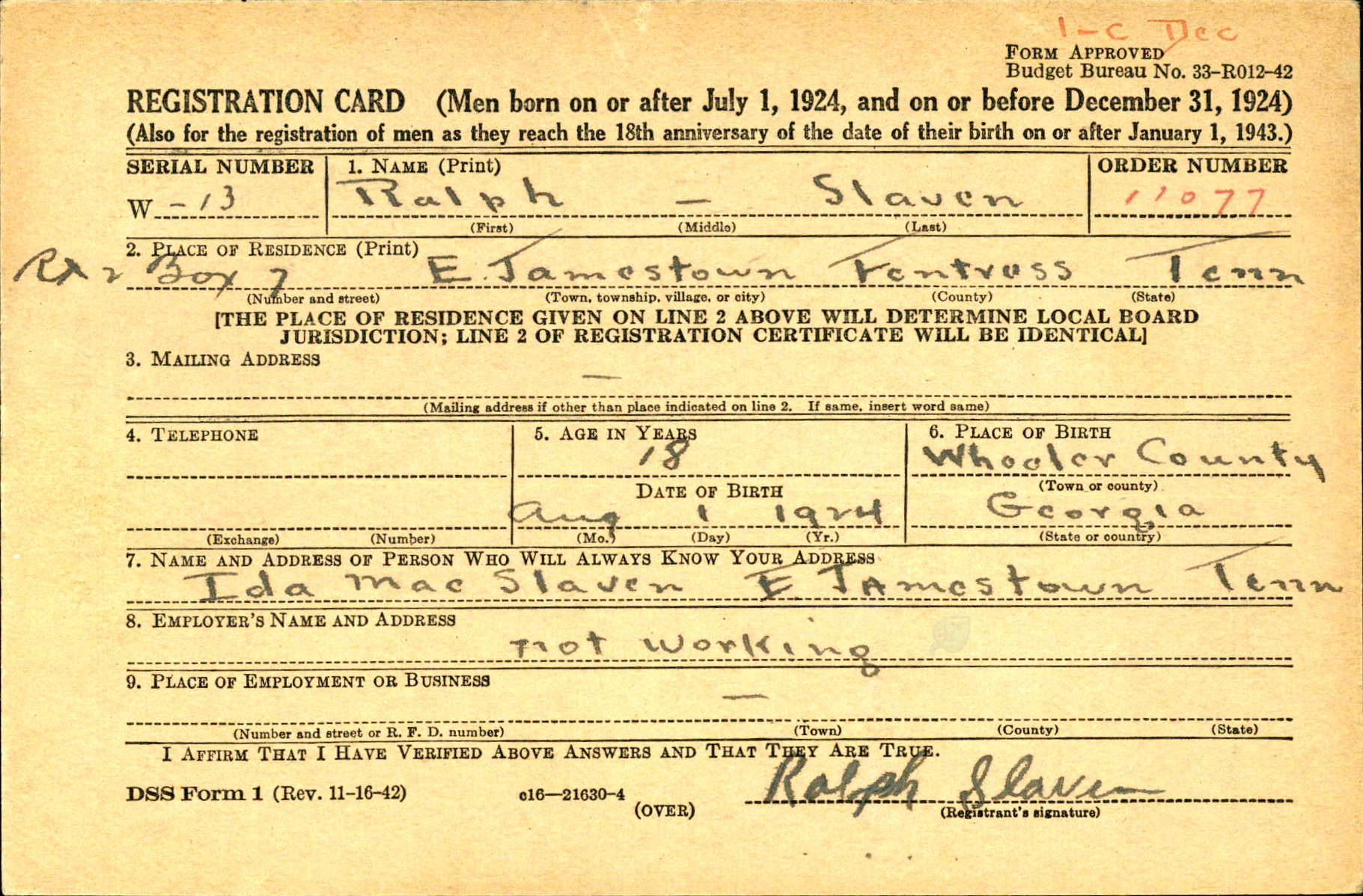 Ralph Slaven was born on 1 August 1924, the son of Henry Caney Slaven and Ida Mae Barnett.