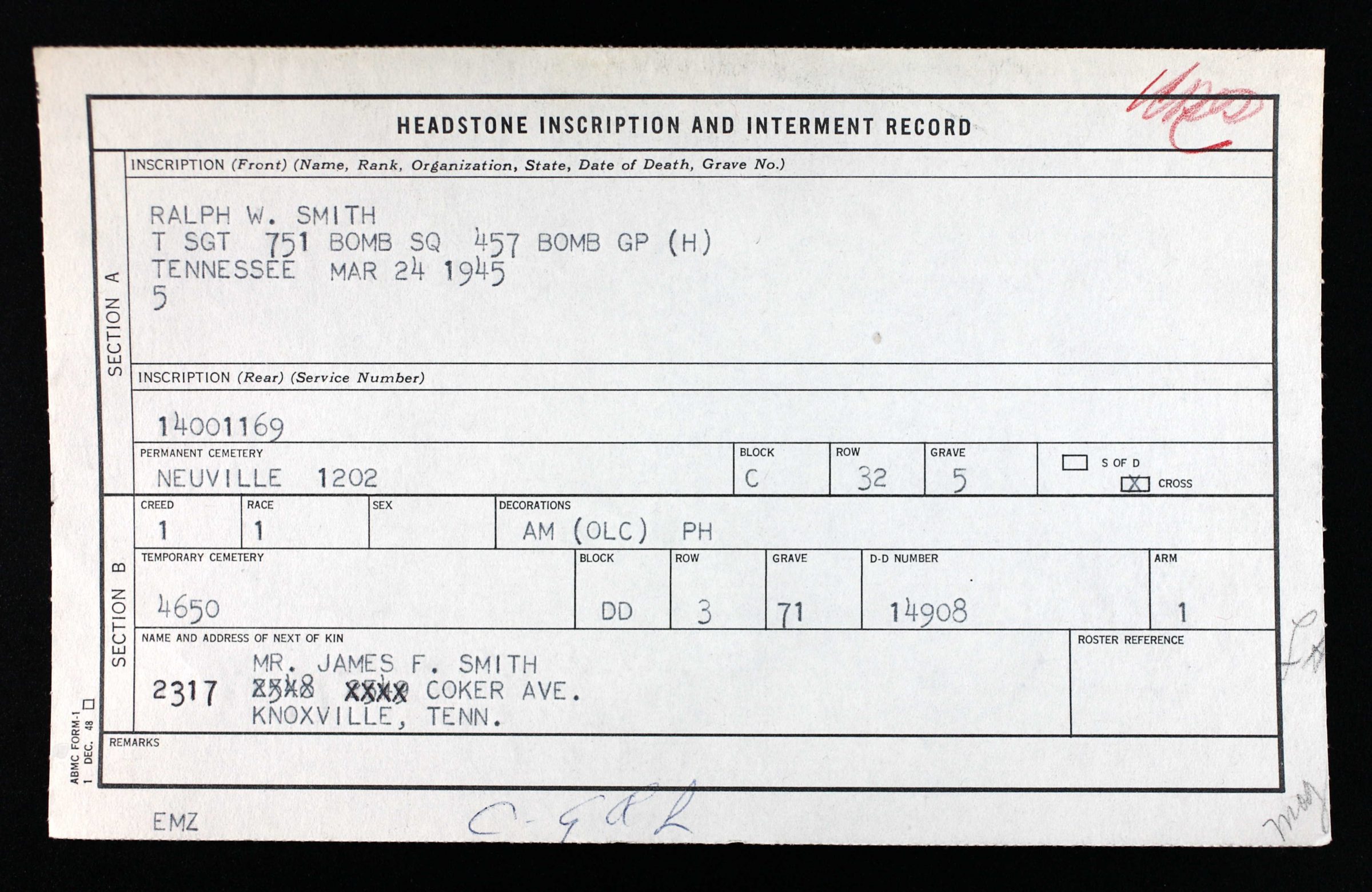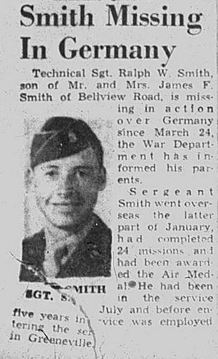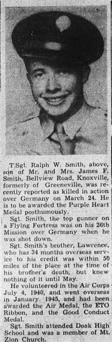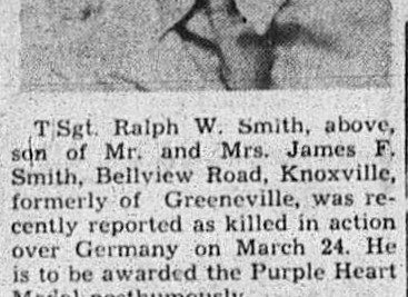 Ralph W. Smith died in the same aircraft as 2nd Lt Sherrill R. Williams of Anderson County, Tennessee.