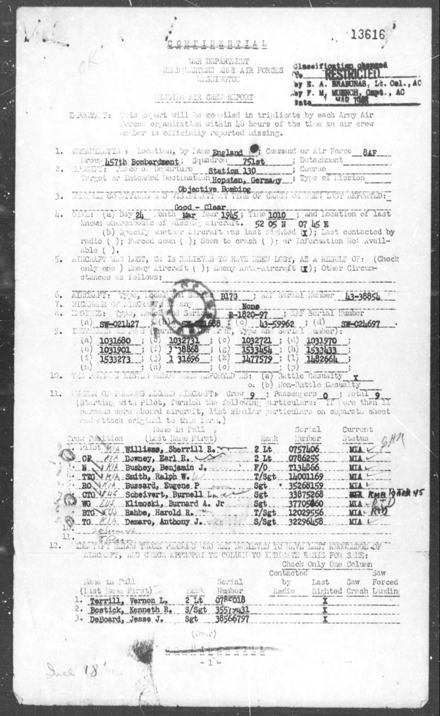 At 10:13 a.m., the Tennessee Toddy went into a spin and broke in half. On that morning, 44 days before the war would end, life ceased for six American airmen–the pilot, Williams; the co-pilot, Earl Downey; the flight officer, Benjamin Bushey; and sergeants Ralph Smith, Eugene Bussard and Anthony Demaro.