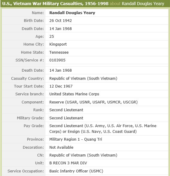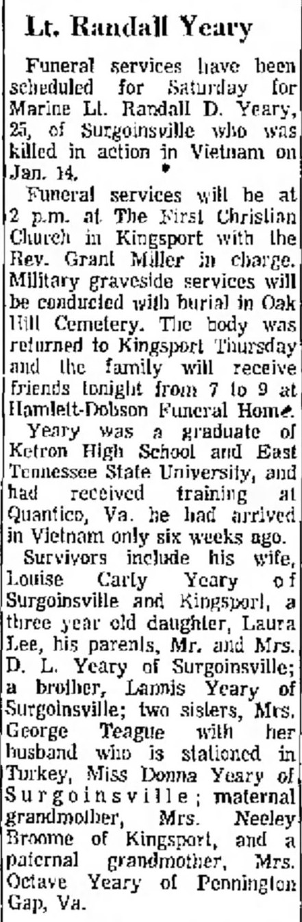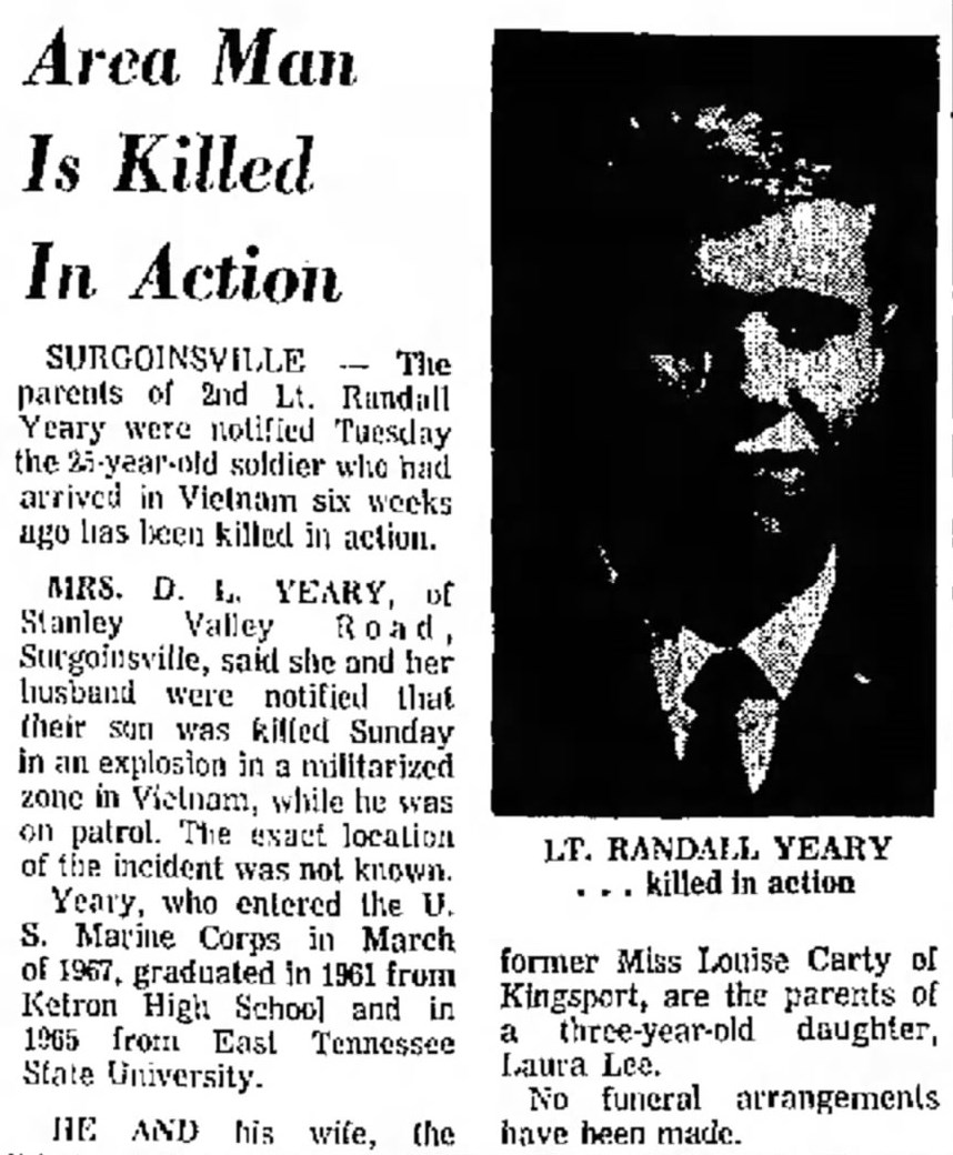 Lt Yeary, who entered the U.S. Marine Corps in March on 1967, graduated in 1961 from Ketron High School and in 1965 from East Tennessee State University. He was killed in an explosion in a militarized zone in Vietnam, while he was on patrol. He was married to Louise Carty and father of Laura Lee Yeary.