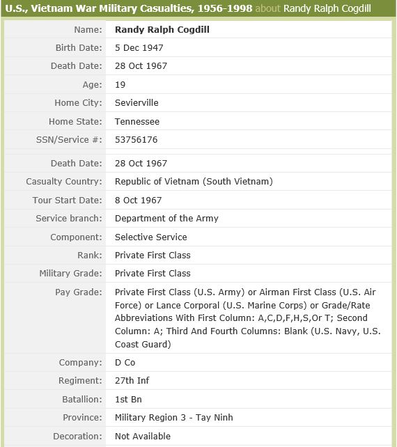 Private First Class Randy Ralph Cogdill was born on December 5, 1947, and was the son of Mr. and Mrs. Claude W. Cogdill. He was originally from Sevierville, Tennessee. He served his country in the Vietnam War in the United States Army, as an infantryman in D Company, 1st Battalion, 27th Infantry, 25th Infantry Division. His tour in Vietnam began on October 8, 1967. Only twenty days later, on October 28, 1967, PFC Cogdill was killed under hostile conditions in Tay Ninh province, South Vietnam, at the age of 19. He was a recipient of the Purple Heart medal. PFC Cogdill is buried at Shiloh Memorial Cemetery in Pigeon Forge, Tennessee, and is memorialized on the Vietnam Veterans Memorial on Panel 28E, Line 90.