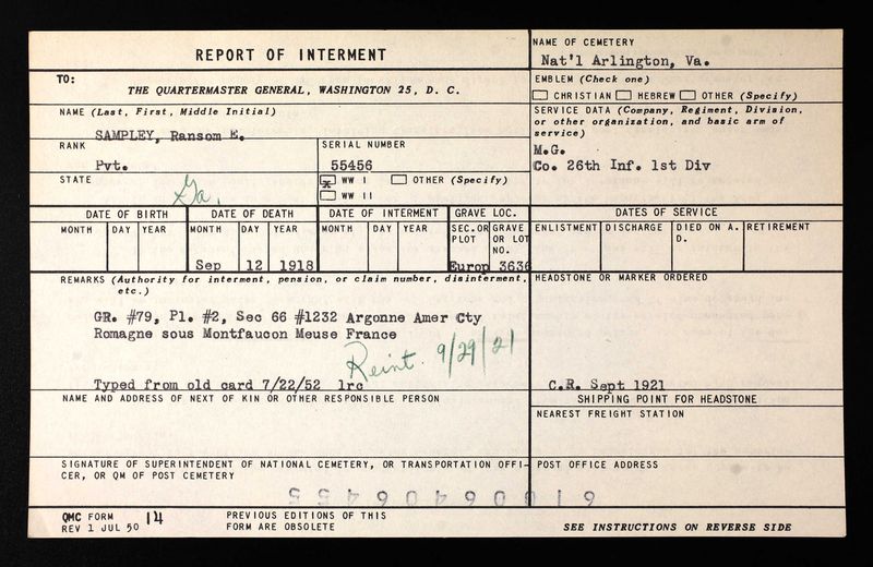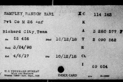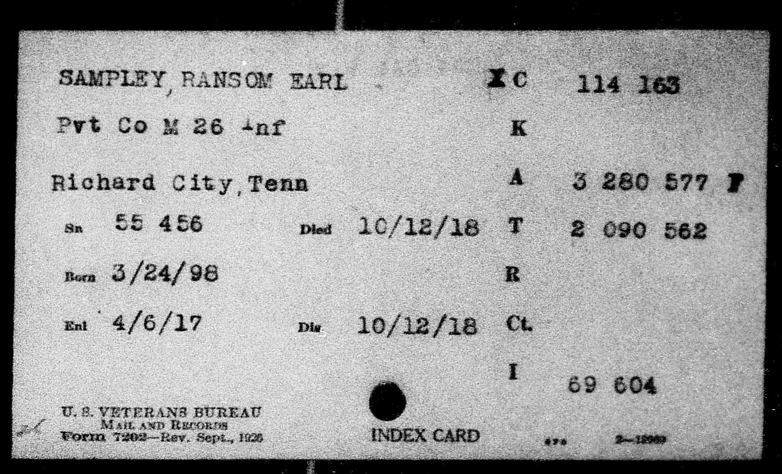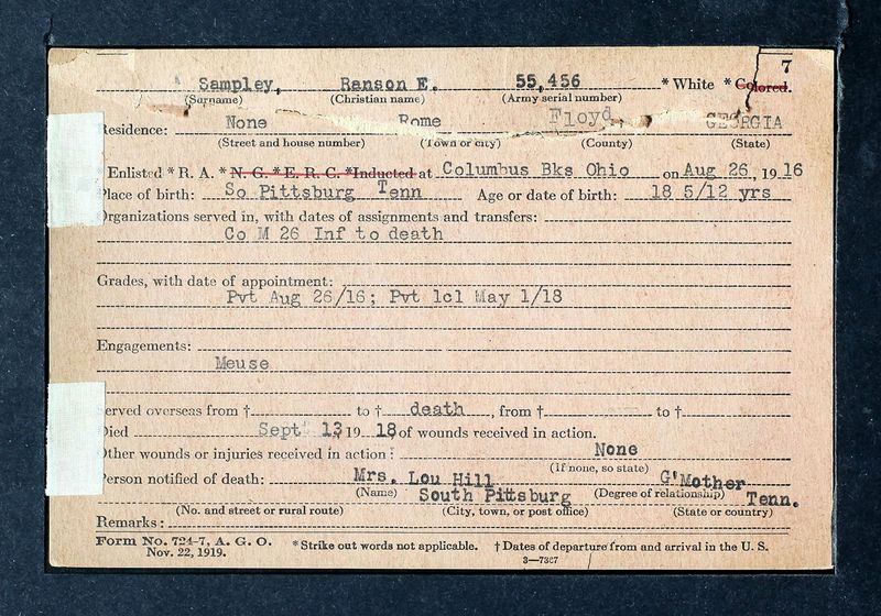 Ransom Earl Sampley was born at South Pittsburg, Tennessee to Albert and Ollie Sampley. He enlisted on 26 August 1916 at Columbus Bks, Ohio as a Private. He resided at Rome, Floyd County in Georgia. He got promoted to Private First Class on 1 May 1918. He died at the age of 18. PFC Sampley was initially buried at the Argonne American Cemetery, Romagne sous Montfaucon, Meuse, France.