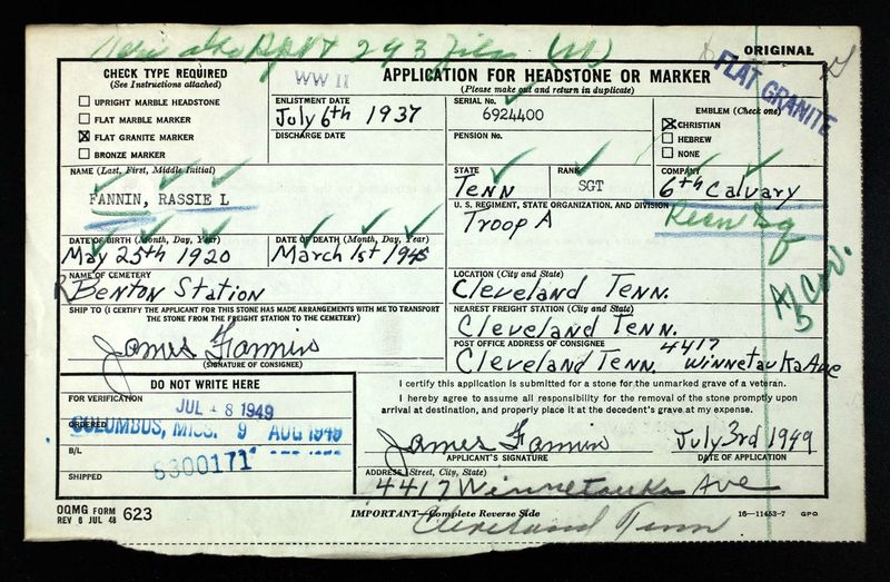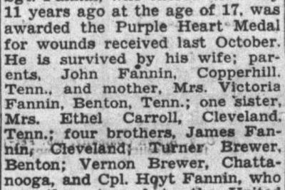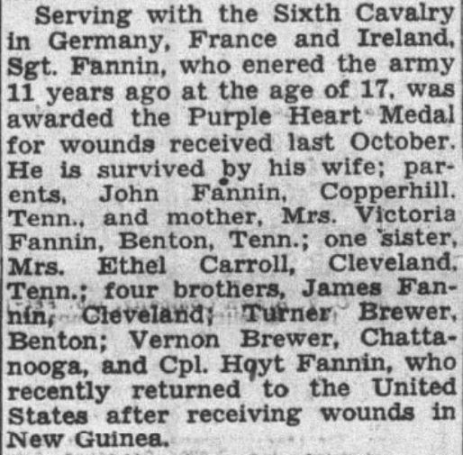 A member of the Sixth Cavalry, Sgt. Rassie L. Fannin, husband of Mrs. Geneva Fannin, 1800 Bailey Avenue, was listed killed in action in Germany March 1. Serving in Germany, France and Ireland, Sgt. Fannin, who entered the army 11 years ago at the age of 17, was awarded the Purple Heart Medal for wounds received last October. He is survived by his wife; parents, John Fannin, Copperhill, Tenn., and mother, Mrs. Victoria Fannin, Benton, Tenn.; one sister, Mrs. Ethel Carroll, Cleveland, Tenn.; four brothers, James Fannin, Cleveland; Turner Brewer, Benton; Vernon Brewer, Chattanooga, and Cpl. Hoyt Fannin, who recently returned to the United States after receiving wounds in New Guinea.