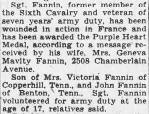 Members of Hamilton County families, yesterday were reported as war casualties. Wounded was Sgt. Rassie L. Fannin. Sgt. Fannin, former member of the Sixth Cavalry and veteran of seven years’ army duty, has been wounded in action in France and has been awarded the Purple Heart Medal, according to a message received by his wife, Mrs. Geneva Mavity Fannin, 2508 Chamberlain Avenue. Son of Mrs. Victoria Fannin of Copperhill, Tenn., Sgt. Fannin volunteered for army duty at the age of 17, relatives said.