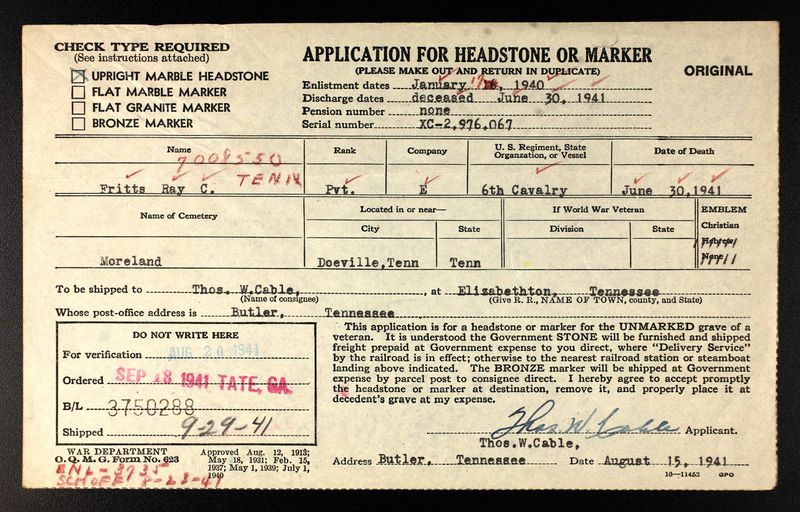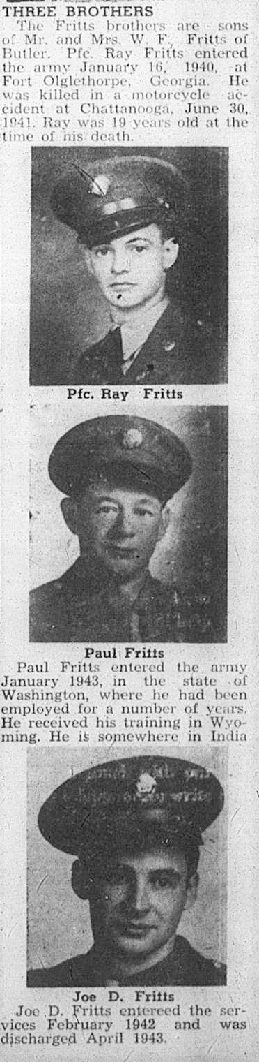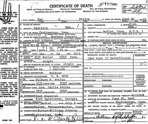 He entered the army January 16, 1941 at Fort Oglethorpe in Georgia. Pvt Fritts died 30 June 1941, due to an motorcycle accident at Chattanooga, Tennessee. He is buried at the Moreland Cemetery located on Roan Creek Road. He had two other brothers in service.