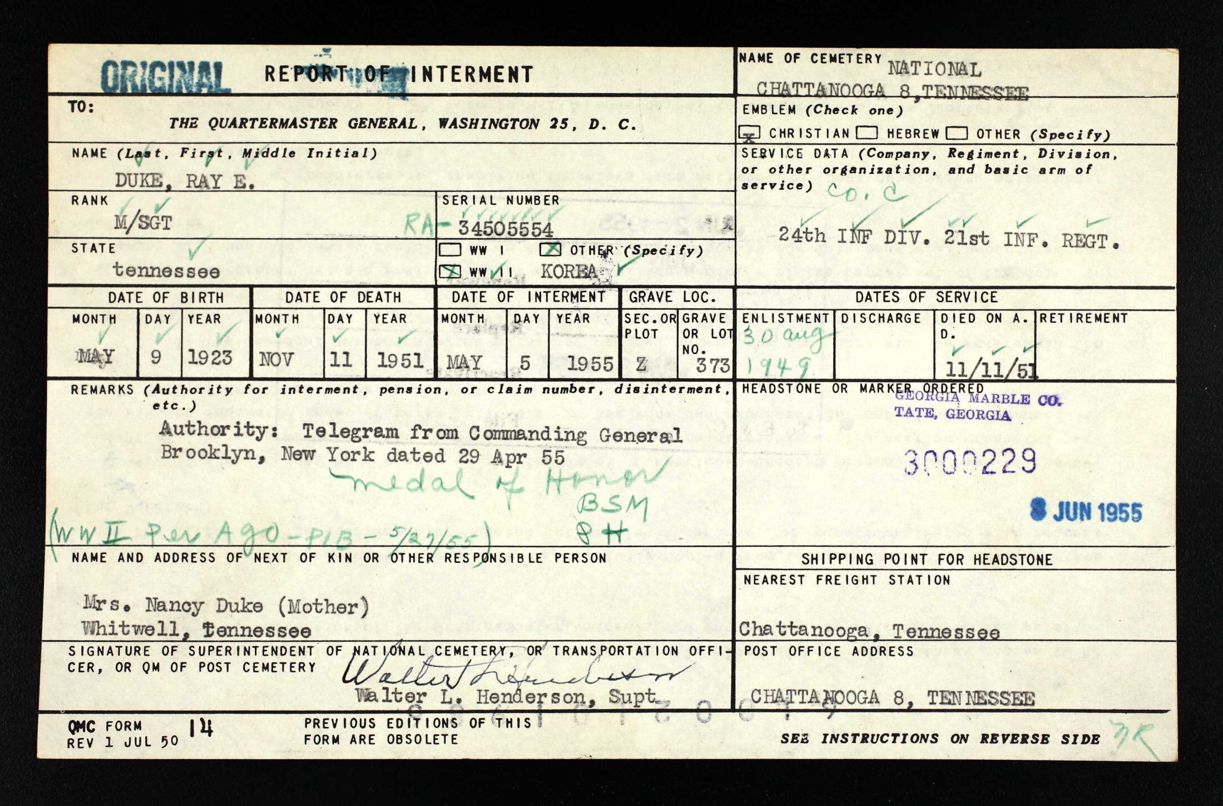 Sfc. Duke, a member of Company C, distinguished himself by conspicuous gallantry and outstanding courage above and beyond the call of duty in action against the enemy. Upon learning that several of his men were isolated and heavily engaged in an area yielded by his platoon when ordered to withdraw, he led a small force in a daring assault which recovered the position and the beleaguered men. Another enemy attack in strength resulted in numerous casualties but Sfc. Duke, although wounded by mortar fragments, calmly moved along his platoon line to coordinate fields of fire and to urge his men to hold firm in the bitter encounter.