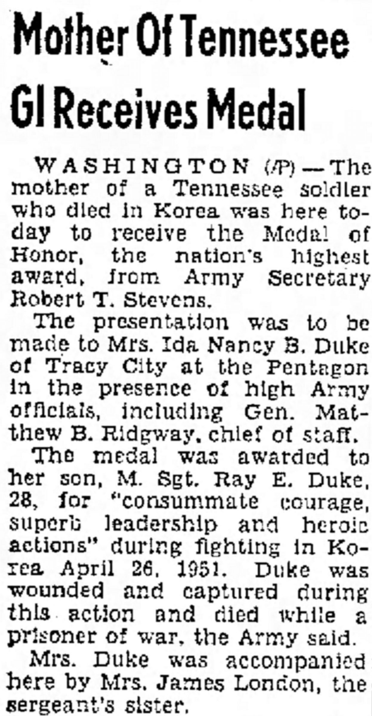 Photos below of presentation of Duke’s posthumous Medal of Honor to his mother, Nancy Ida Duke.