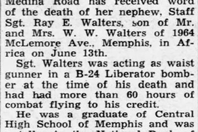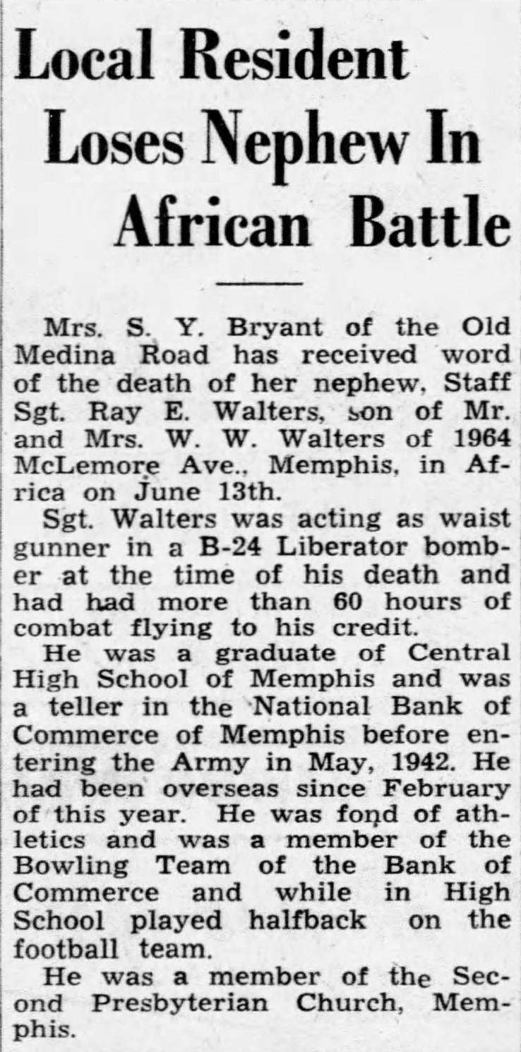 Mrs. S.Y. Bryant of the Old Medina Road has received word of the death of her nephew, Staff Sgt. Ray E. Walters, son of Mr. and Mrs. W.W. Walters of 1964 McLemore Ave., Memphis, in Africa on June 13th. Sgt Walters was acting as waist gunner in a B-24 Liberator bomber at the time of his death and had had more than 60 hours of combat flying to his credit. He was a graduate of Central High School of Memphis and was a teller in the National Bank of Commerce of Memphis before entering the Army in May, 1942. He had been overseas since February of this year. He was fond of acthletics and was a member of the Bowling Team of the Bank of Commerce and while in High School played halfback on the football team. He was a member of the Second Presbyterian Church, Memphis.