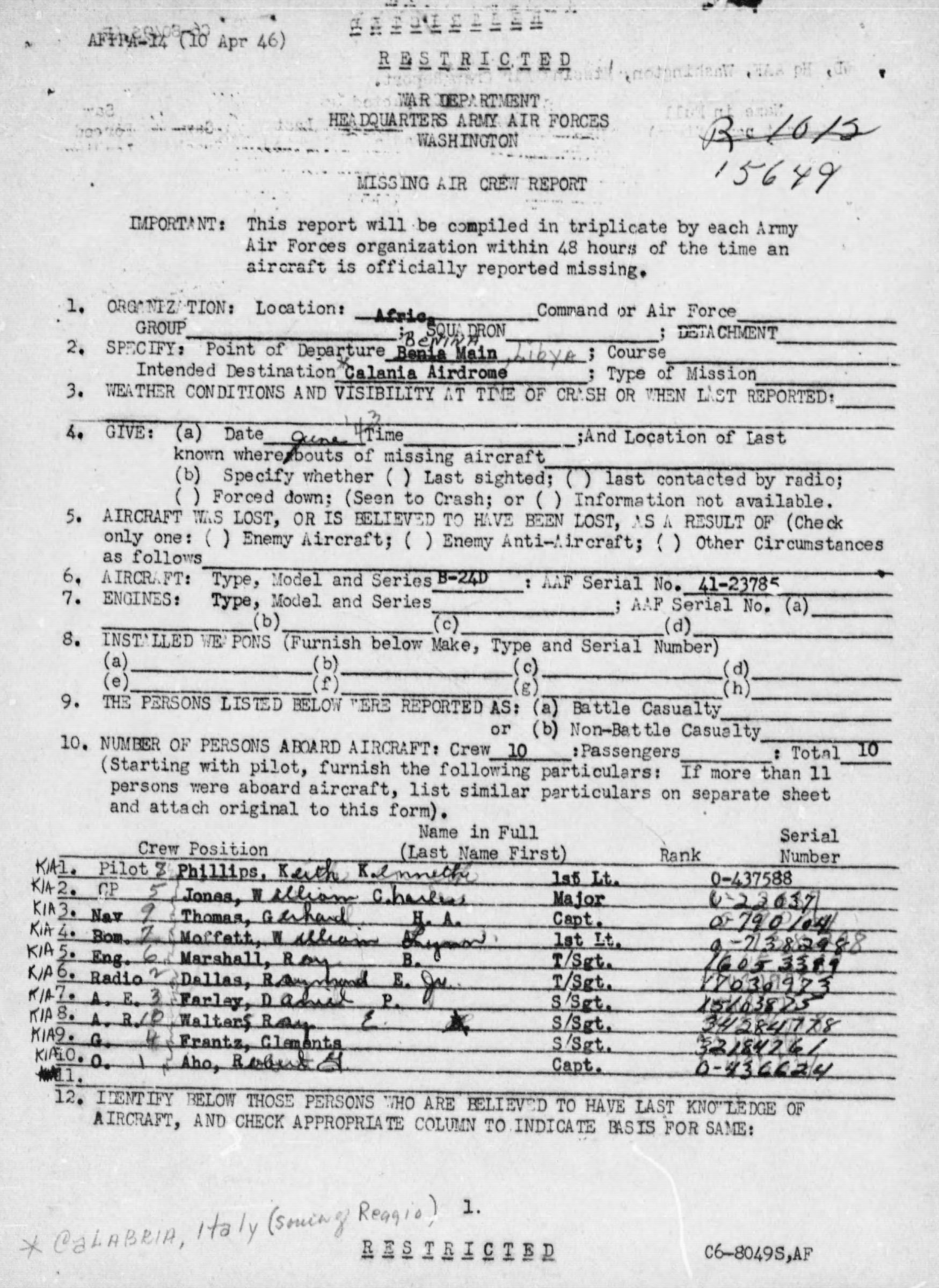 Aircraft B-24D with serial number 41-23785 departed from Benina Main in Libya on a bombing mission to Calania Airdrome, Calabria in Italy. This aircraft collided with aircraft 41-11806 in mid-air. They fell together, both spinning to the right. Half of the stabilizer and one vertical fin came off of one aircraft. One of the planes dove into the sea and disappeared immediately; the other made an attempt to recover from the spin. Both planes hit the water with great force about twenty-five or thirty feet apart. The second plane remained afloat for possibly a minute but the top escape hatch remained closed. Neither parachutes nor survivors were observed. The area was thoroughly searched for two hours in a radius of five miles at a low level; however, nothing was seen except one empty life vest which subsequently disappeared, and about twenty or thirty oxygen bottles which drifted away from the rapidly spreading oil slick.
