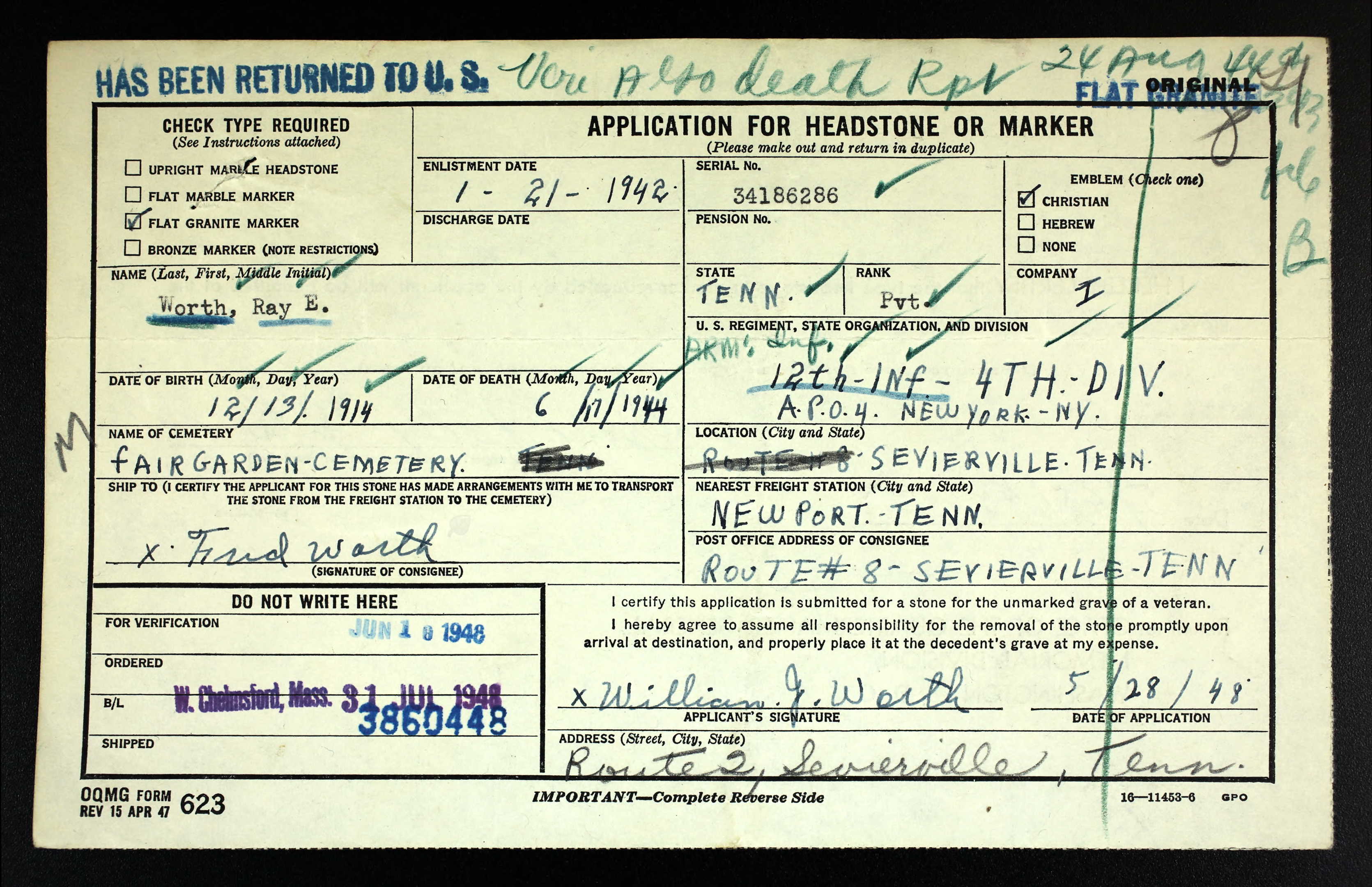 He was returned from Ste-Mère-Eglise No 1 Carentan, France. Buried at Fair Garden Cemetery, Sevierville, TN