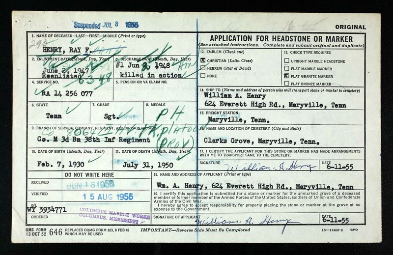 Sergeant Ray F. Henry was born in Blount County, Tennessee, 7 February 1930. He was a member of the 77th Medium Tank Battalion, 7th Infantry Division. He was Killed in Action while fighting the enemy in South Korea on July 31, 1950. He was possibly killed under a bridge that was shelled by the enemy. Sergeant Henry and 14 others of the 77th Medium Tank Battalion had sought refuge there with their wounded comrade, Fowler. Sergeant Henry was one of the eight soldiers that did not return from that mission.